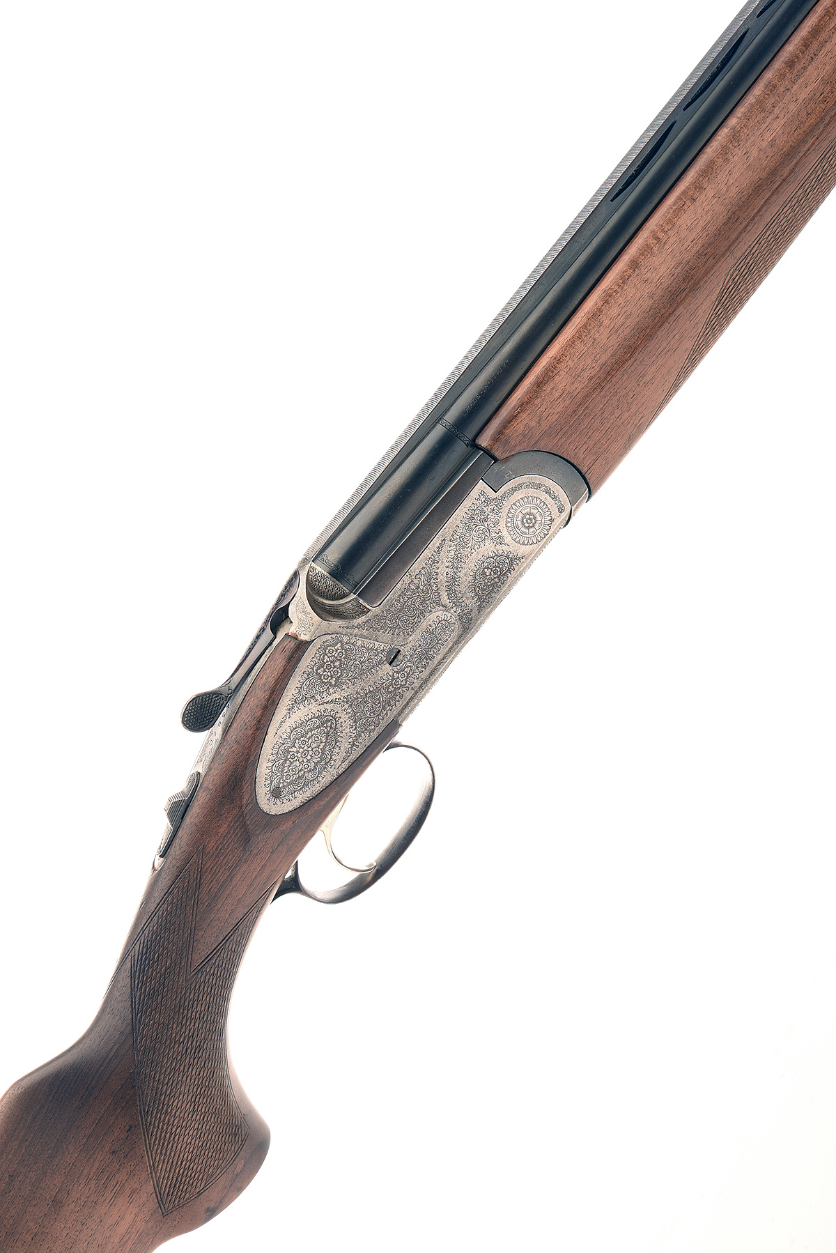 EMILIO RIZZINI 12-BORE SIDEPLATED OVER AND UNDER EJECTOR, serial no. 43870, dated 1986, 28in. nitro barrels with ventilated mid-rib and 12mm ventilated matt top-rib, 2 3/4in. chambers, bored approx. 1/4 and 3/4 choke, hold-open toplever, acanthus scroll engraving, 14 1/4in. pistolgrip stock including 7/8in. ventilated rubber recoil pad