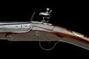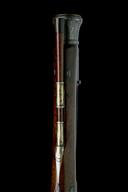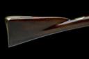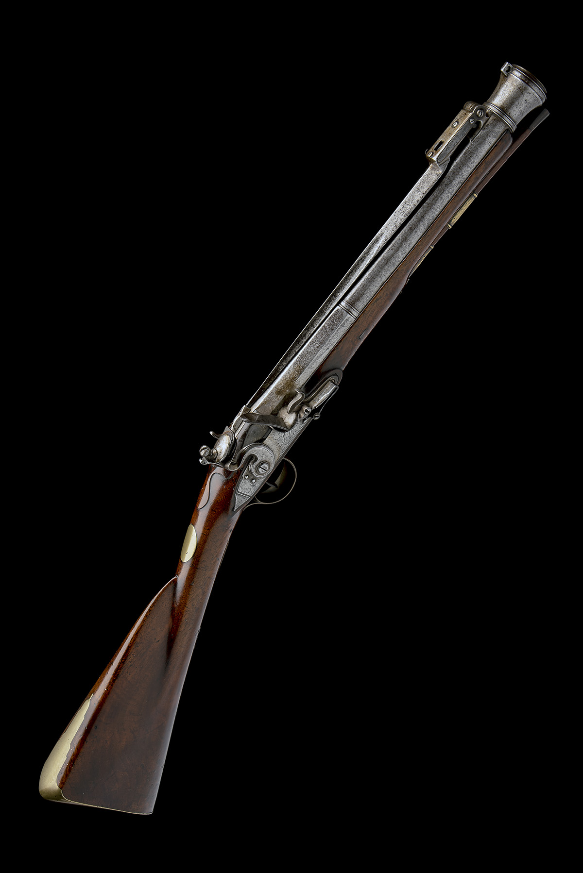 circa 1795, with banded octagonal to round 13 5/8in. barrel, flared and banded muzzle, the top left hand side-flat at breech with London proofs and 'T.K.' maker's mark, folding triangular form fluted bayonet mounted to top of barrel and released via a pull-back catch on the tang, flat, slightly curved lock with stepped tail and signed 'KETLAND & CO.' in script below the pan, no roller to frizzen spring, swan-necked cock, walnut hand-rail full-stock, brass furniture including heel-plate with top-spur, double roll-edged guard with acorn finial and ramrod throat and pipe, original horn tipped wood ramrod with worm end, weight approximately 5 1/2lbs., overall length 29 1/4in.