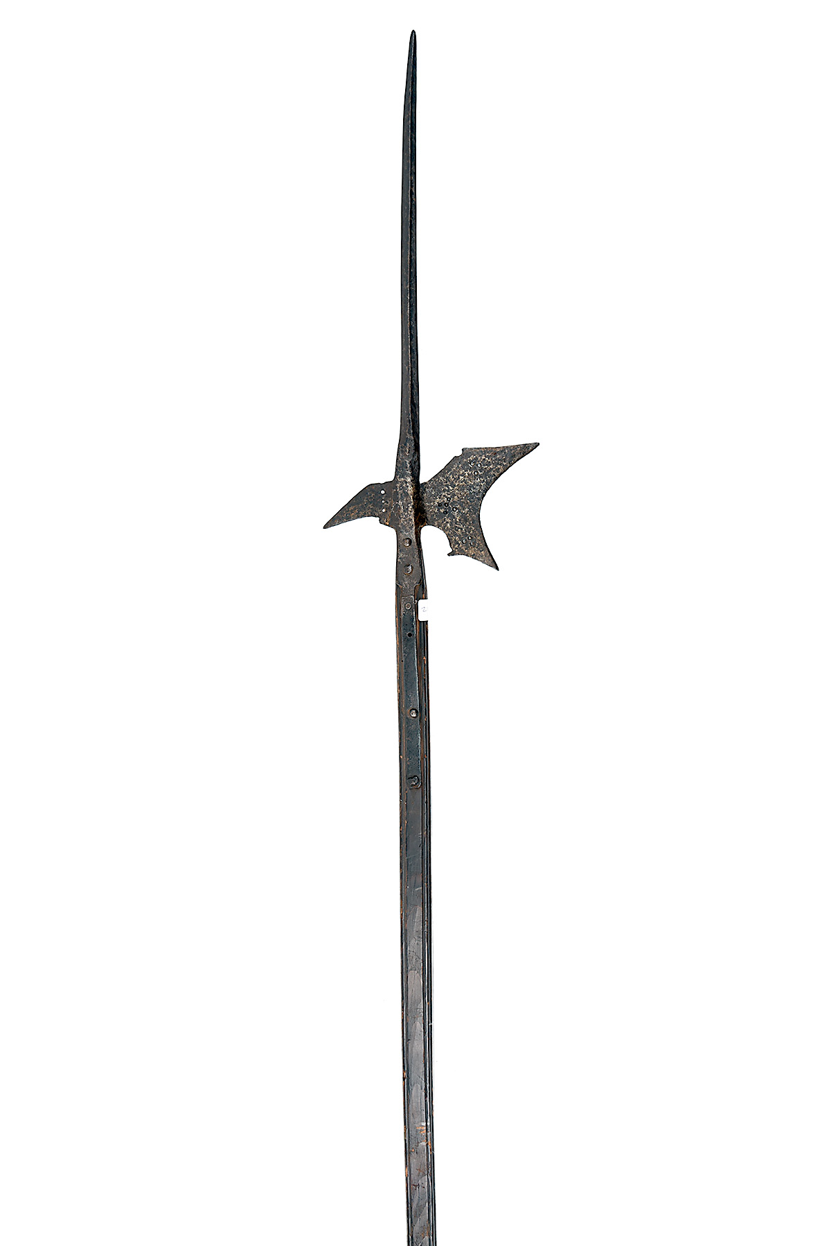 A CONTINENTAL HALBERD believed to be 16th Century, Italian in style, with hand-forged 25in. worn and pitted head comprising 16in. square spear, 3in. pierced beak split on one side, and 5in. pierced semi-circle blade, later attached to a soft-wood square shaft, 90in. overall