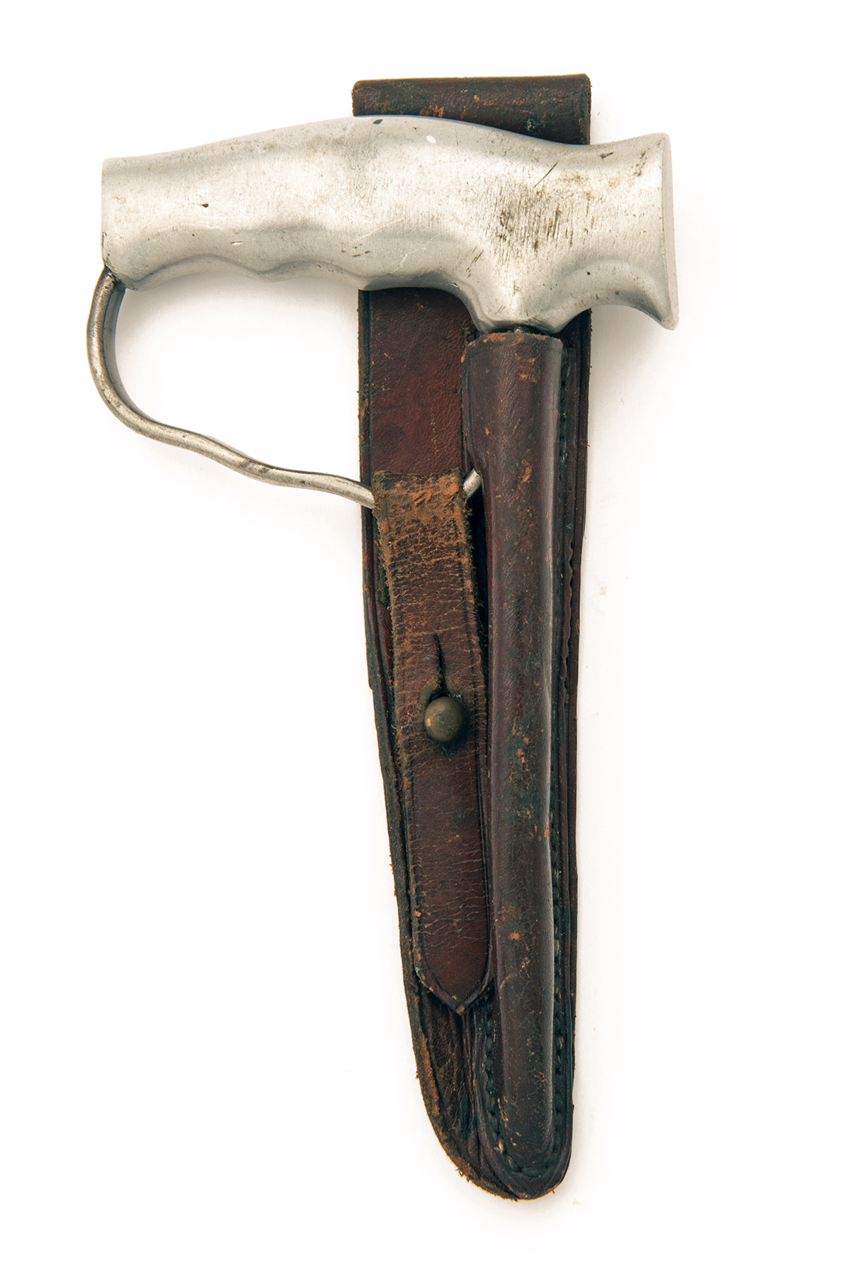 circa 1917, with 5in. stiletto blade, twin narrow blind fullers to each side joining near the tip, cast and moulded aluminium handle with a shaped iron finger-guard for three fingers, the narrow end of hilt stamped 'ROBBINS DUDLEY', good condition and complete with its original leather belt-scabbard with button-down tie, overall length of knife 6 1/2in., weight under 1lb.