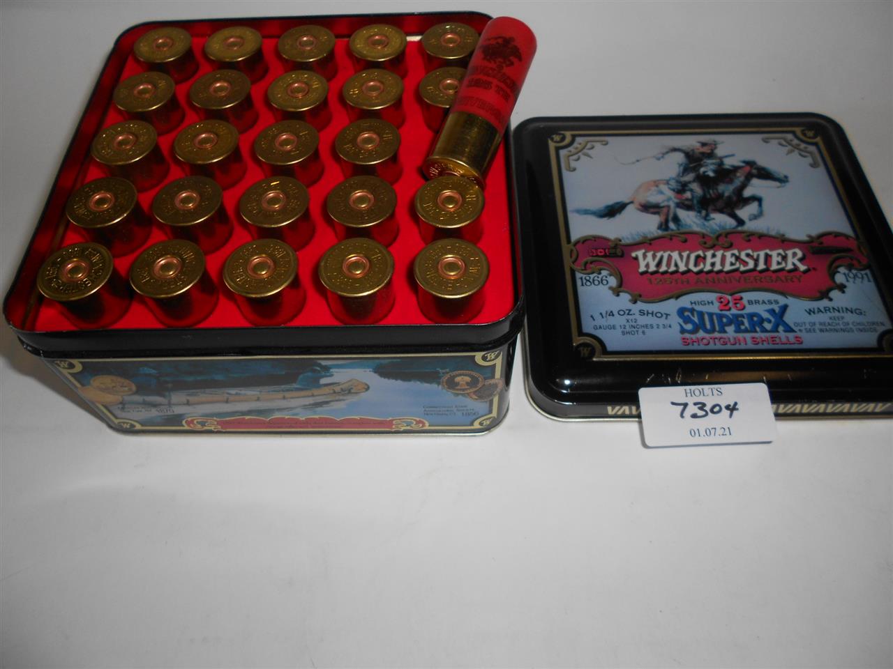 25 WINCHESTER 12 BORE SHOTGUN CARTRIDGES IN A HIGHLY COLLECTABLE 125th ANNIVERSARY EMBOSSED PRESENTATION WINCHESTER TIN, 1 1/4oz, 2 3/4in, 6 SHOT Please be advised that cartridges/ammunition, primers, primed cases, blanks and percussion caps cannot be sent to you by post or carrier. If you wish, you can book a collection at one of our regional valuation days, or collect from our offices at PE31 6HA in Norfolk