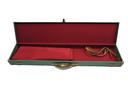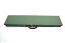 A GREEN CANVAS AND LEATHER RIFLE / GUN CASE, the internal boxing missing, internal measurement 38in. x 7 1/2in., brass lock (including key)