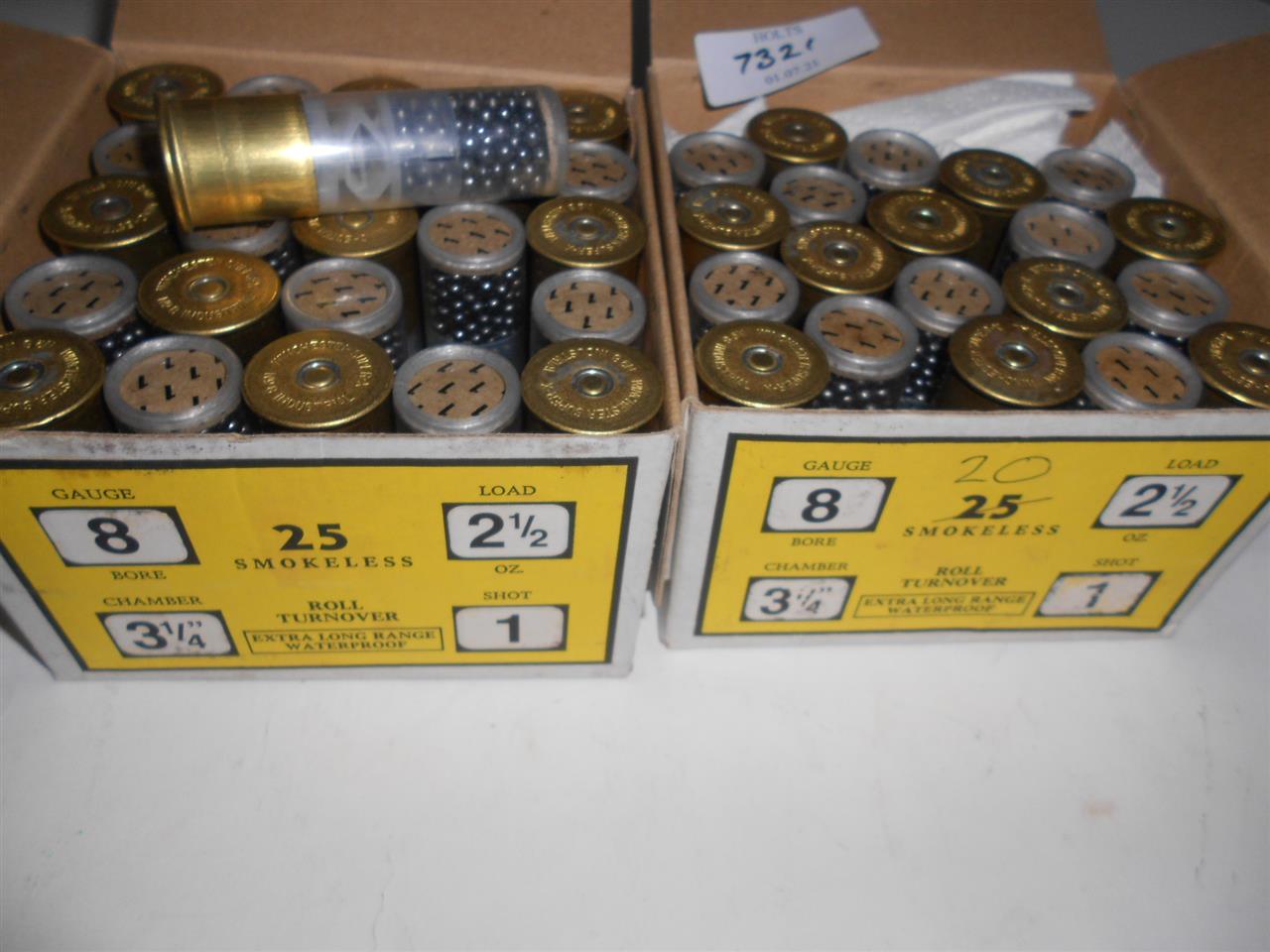 45 ALAN MYERS 8 BORE CARTRIDGES, RT, PLASWAD, 2 1/2oz., 3 1/4IN., No.1 SHOT, EXTRA LONG RANGE Please be advised that cartridges/ammunition, primers, primed cases, blanks and percussion caps cannot be sent to you by post or carrier. If you wish, you can book a collection at one of our regional valuation days, or collect from our offices at PE31 6HA in Norfolk