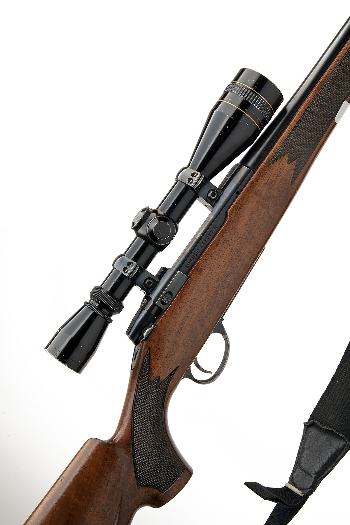 LEFT-HANDED SAKO .243 WIN 'M591' BOLT-MAGAZINE SPORTING RIFLE, serial no. 881927, circa 1996, 22 1/8in. unsighted nitro barrel, threaded for sound moderator, fitted with a leupold 4x12 telescopic sight, manual safety, hinged floorplate, 14 1/8in. pistolgrip stock (including extension and recoil pad) with cheekpiece, canvas sling