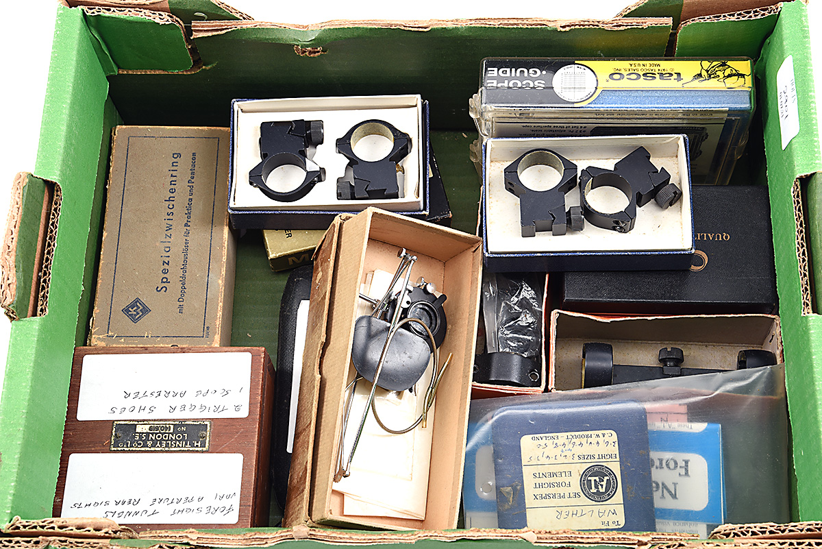 A COLLECTION OF SHOOTING RELATED ITEMS, comprising of Tasco scope guide, Perspex foresight elements, 6 x sets of scope rings, fore-sight tunnels, 2 trigger shoes, a scope arrester