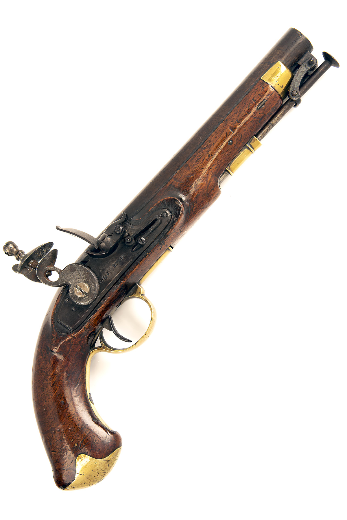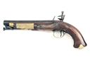 circa 1823, with 8 7/8in. iron barrel, flat sighting plane signed 'DUBLIN', solid top-tangs, flat, bevel-edged step-tailed lock quite crudely signed 'W & J RIGBY' semi rain-proof pan, roller frizzen-spring, walnut full-stocks with flat fish-tail butts of Irish form, brass furniture and iron stirrup ramrod, the fore-end with gummed label stating 'Dug up from cellar of M & L Bank in Wexford around 1922 and donated by Mr O'Neill of M & L', overall length 15in. weight approximately 2 1/2lbs.