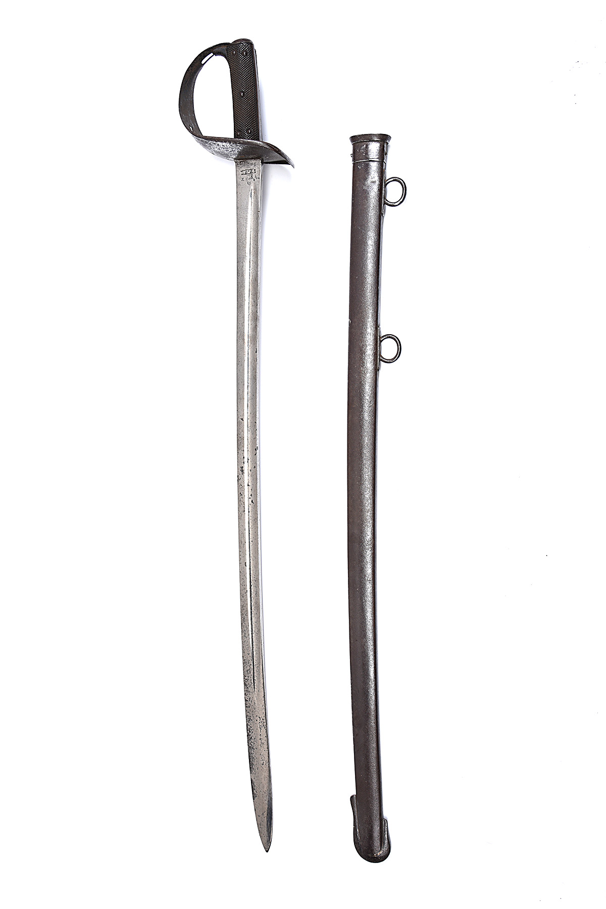 A PATTERN 1882 CAVALRY TROOPER'S SWORD, early 1880s, with plain 33in. single-edged blade fullered on both sides, ricasso marked with WD, broad arrow 'YC' bend test 'X' and reissue date of 12.90 on one side of ricasso and an issue date of 9/85 and Birmingham repair inspection mark of /95 to the other side, steel guard with pierced Maltese Cross, pressed leather grips, together with its steel scabbard, blade with edge nicks, some staining and pitting, guard with rusting and pitting, scabbard stained, pitted and with shallow dents