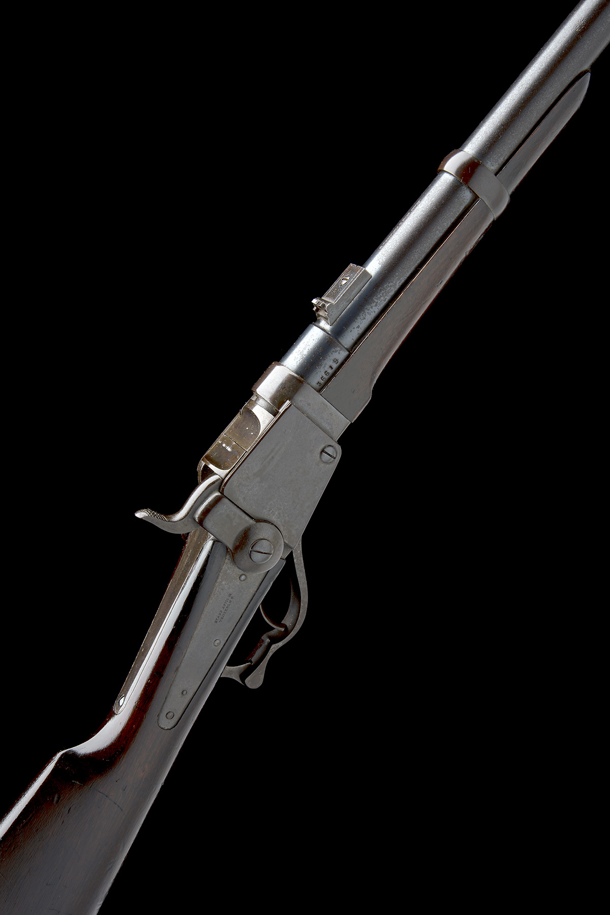 circa 1862, with round tapering 21in. barrel signed 'STARR ARMS CO, YONKERS N.Y.', dove-tailed blade fore-sight, folding notch and 'battle' sight, 'sold out of service' arrows at breech, square receiver with falling-block mechanism and saddle-ring mounted to left hand side, plain top tang, the back-action lockplate signed 'STARR ARMS CO, YONKERS N.Y.', straight slab-sided hammer, walnut straight-hand butt-stock with US martial cartouches at head and a broad arrow and 'W.D.' stamp to right side of butt, splinter fore-end, iron heel-plate and barrel-band and iron underlever forming the trigger-guard, overall length 38in., weight approximately 7 1/2lbs.