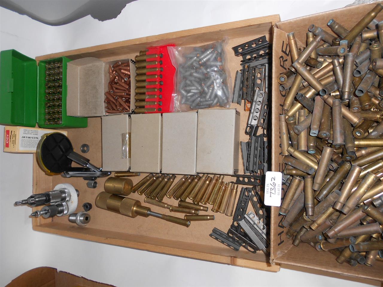 .303 RELOADING EQUIPMENT, DIES, CASES, BULLETS, PRIMERS, CLIPS, .303 reloading equipment - 200 .303 fired cases some with corrosion and 1940's date stamps, Hydro Punch primer tool for removing Berdan primers, , Lee .303 Priming tool with case holder, 25 .303 No. 4 charging clips, 100 110 grn .303 lead bullets, 500 .303 174 grn, FMJ bullets, 1 packet large rifle primers (opened), .303 loading dies and shell holder, lengthening die, burring tool, primer pocket cleaning tool, 19 primed cases.