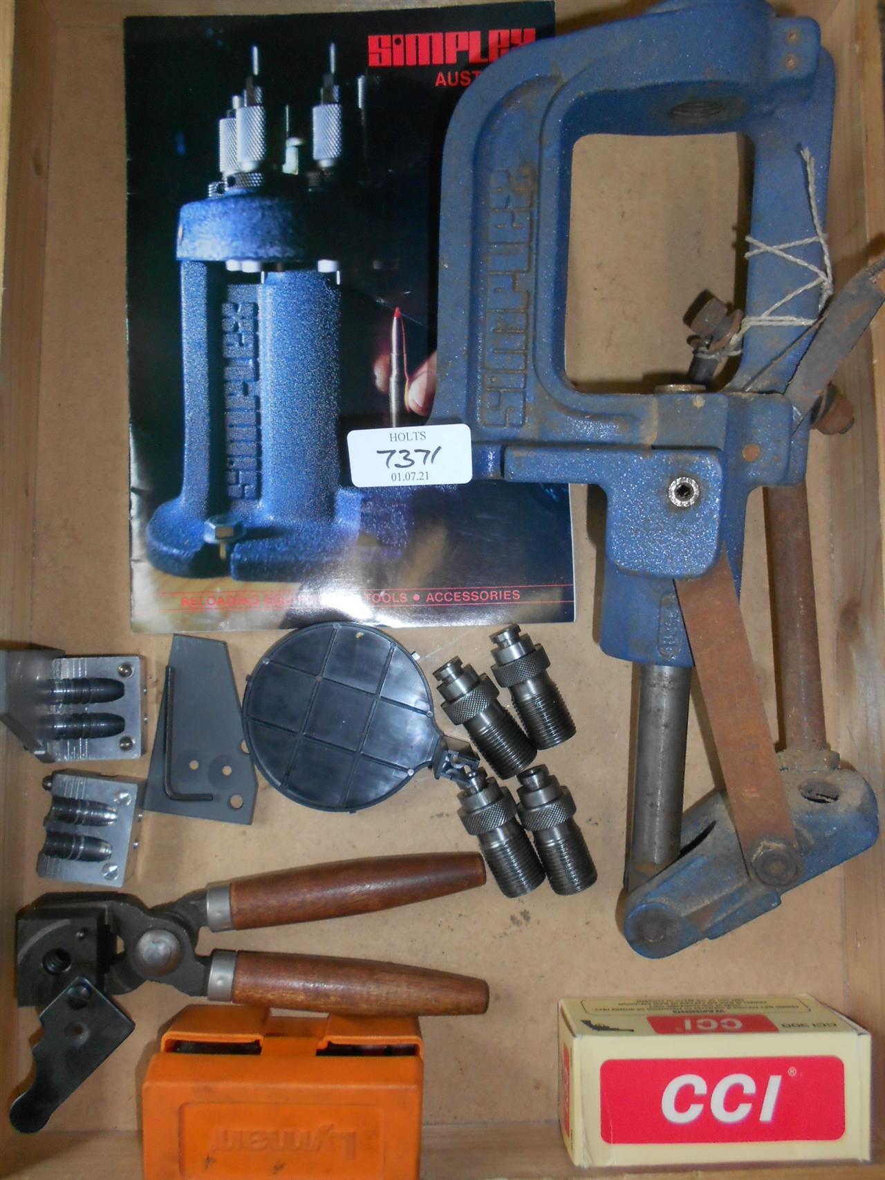 a Simplex heavy duty press, with corrosion present, bench bolts and an instruction manual, a Lyman mould # 4571936W / 129, one set RCBS moulds #425-446 -11.4mm, one set Lyman # 636 - 11.35mm in Lyman handle set, four bullet seating tools, .577, 12mm ,11.73mm, 603mm with a Lee primer tray as a spare part,