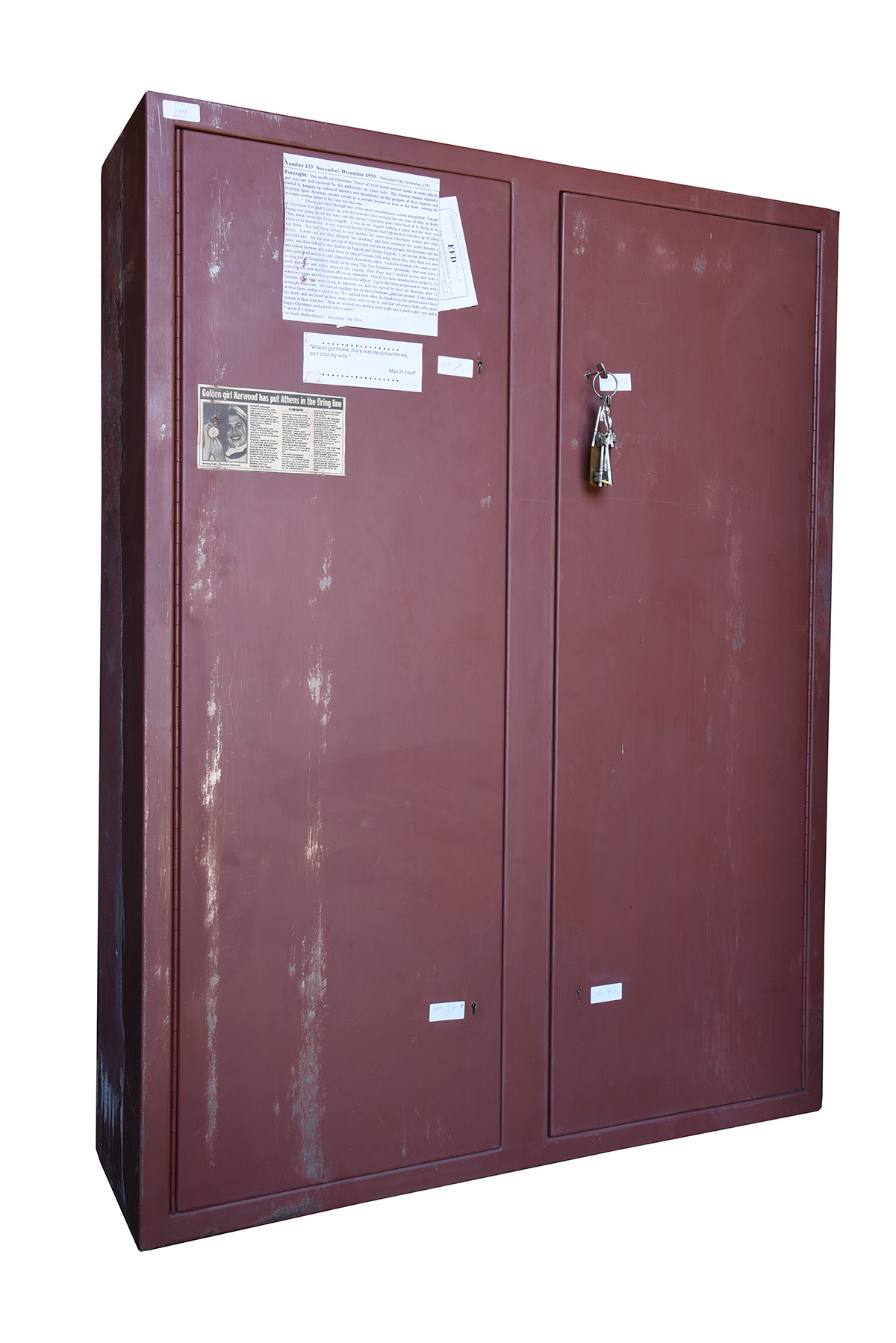 two gun cabinets joint to one, two separate doors, each side fitted for 7 guns, the cabinet measuring approx. 56in. x 43in. x 12in.