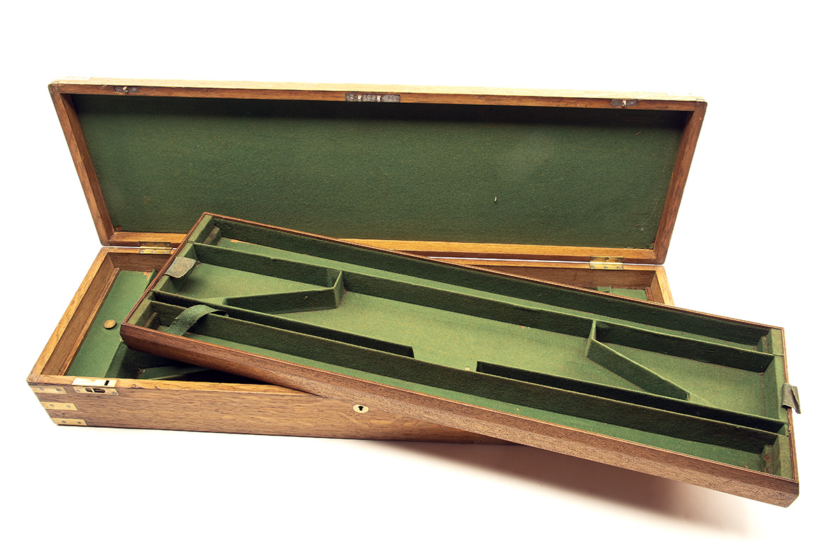 A BRASS-BOUND OAK TWO-TIER PERCUSSION DOUBLE GUNCASE,