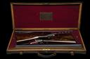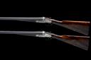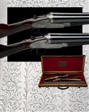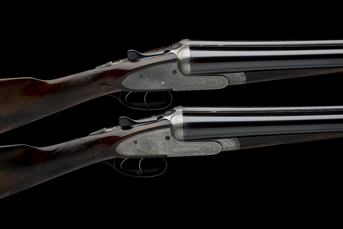 for 1902, 28in. replacement nitro barrels (in 1965), the tubes engraved 'HENRY ATKIN LTD. 7. BURY STREET. ST. JAMES'S, LONDON ENGLAND', the ribs gold-inlaid '1' and '2' at the breech ends, 2 1/2in. chambers, bored approx. 1/4 choke both (No.1) and 1/4 and 1/2 choke (No.2), No.1 left wall thickness at 19, toplevers gold-inlaid '1' and '2', automatic safeties with gold-inlaid 'SAFE' details, chequered front triggers, best fine acanthus scroll engraving with beaded bordering, the action flats engraved 'E.C. HODGES', brushed bright and reblued finish overall, 15 1/4in. boldly-figured replacement stocks (in 1965), No.2 stock with minor setting cracks to rear of lockplates, weight 6lb. 8oz. (No.1) and 6lb. 9oz. (No.2), in their brass-cornered oak and leather case