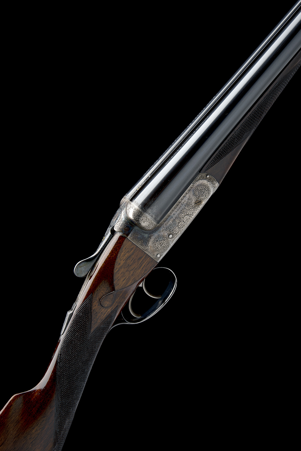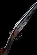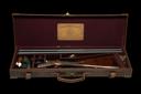 circa 1955, 26in. replacement nitro barrels (in 1972), the tubes engraved 'CHARLES HELLIS & SONS LTD. 7, BURY STREET, ST. JAMES'S, LONDON, ENGLAND', the rib inlaid 'FOR 2 INCH CASE ONLY' (faint) and gold-inlaid '2', 2in. chambers, bored approx. 1/2 choke in both, toplever gold-inlaid '2', automatic safety, acanthus scroll engraving with floral bouquets, retaining some original colour-hardening and finish, 14 7/8in. stock including 1 1/8in. wooden extension, small insert repair to fore-end wood at knuckle, weight 5lb. 12oz., in a brass-cornered leather hammergun case with Atkin, Grant & Lang (incorporating Charles Hellis & Sons), 7 Bury Street address trade label