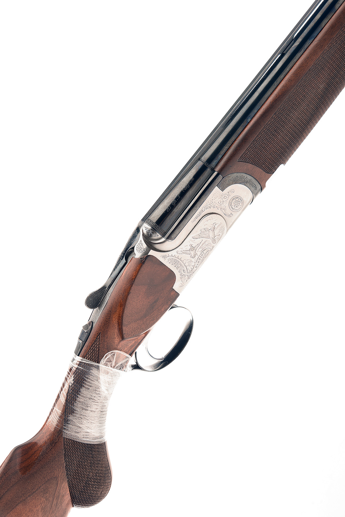 RIZZINI 20-BORE (3IN. MAGNUM) 'AURUM' SINGLE-TRIGGER OVER AND UNDER EJECTOR, serial no. 52927, dated 2004, 27 1/4in. nitro barrels (top barrel extractor broken) with 6mm ventilated matt top-rib, 3in. chambers, bored approx. true cyl. in both, hold-open toplever, manual safety with integral barrel selector switch, partial floral and acanthus scroll engraving surrounding game scenes, triggerguard partially detached, 13 3/4in. semi-pistolgrip stock including 5/8in. rubber recoil pad, weight 6lb.