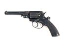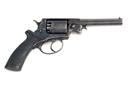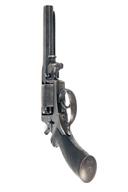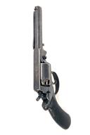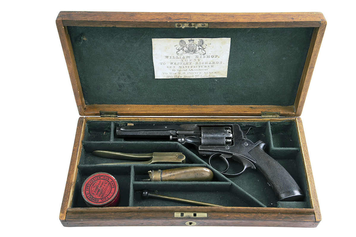 circa 1858, with blued octagonal 5 1/2in. barrel, the top-strap signed 'WILL'M BISHOP 170 NEW BOND ST'T LONDON', blade fore-sight, standing notch rear-sight, plain cylinder (some replacement nipples), borderline engraved solid frame, sliding safe to right hand side, double action mechanism, chequered walnut semi saw-handled butt and articulated rammer mounted to the left side of barrel, strong traces of blued finish remaining (some bruising); together with its probable original oak casing, lined and compartmented in green baize, reproduction parchment label inside lid and complete with a brass double cavity mould, reproduction flask, cap-tin and cleaning rod, weight of revolver approximately 2 1/2lbs., overall length of same 12 3/4in.