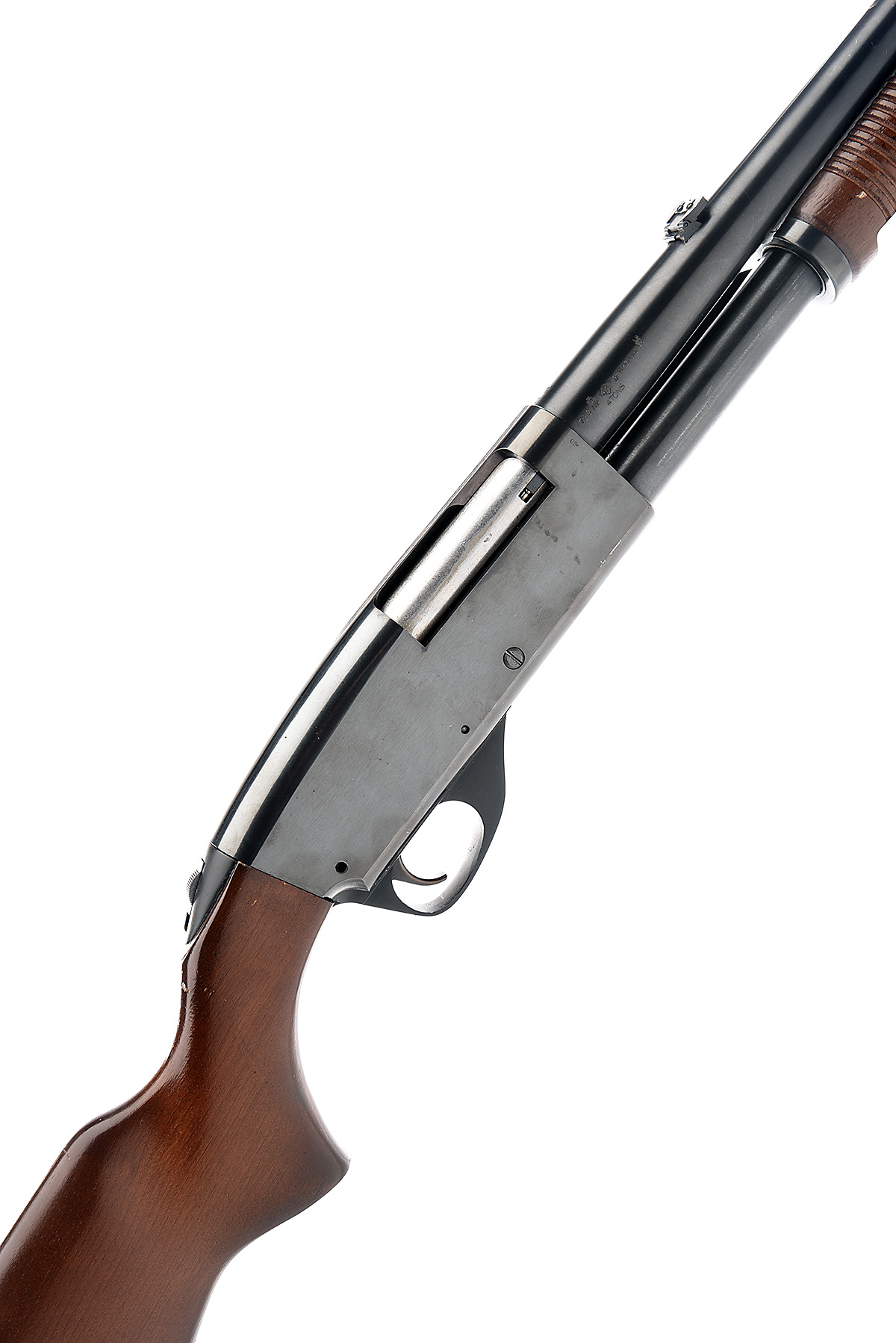 AN F.A.C. STEVENS 12-BORE (3IN.) '67 SERIES E' PUMP-ACTION SHOTGUN, serial no. E107535, circa 1984, 24in. nitro ribless barrel, ramp-mounted bead fore-sight, flip-up notch rear sight, 3in. chambers, bored approx. true cyl. choke, manual top-tang safety, plain blacked action, 14in. pistolgrip stock including ventilated rubber recoil pad