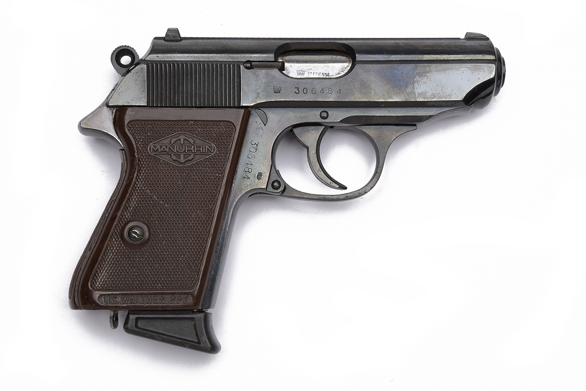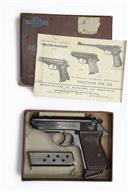** A BOXED 7.65 (.32 ACP) SEMI AUTOMATIC PISTOL SIGNED MANURHIN, MODEL 'PPK' serial no. 306484 with a 3 1/4in. barrel, open sights, slide safety, original bluing with brown chequered plastic grips, with makers carton and instruction booklet.