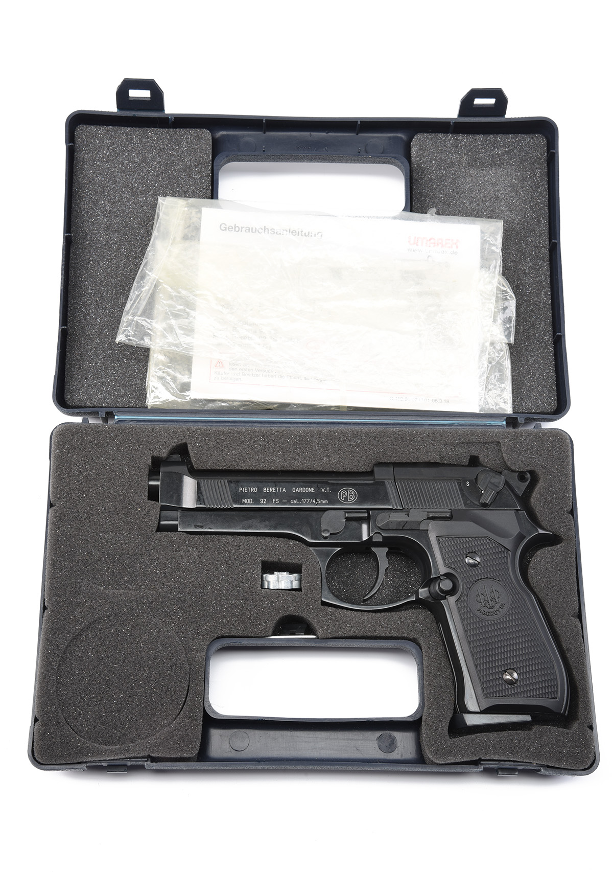 A CASED .177 CO2-POWERED AIR-PISTOL SIGNED UMAREX, MODEL 'BERETTA 92FS', serial no. H071055560, in black finish, appearing unused with instructions in its maker's abs plastic case (untested)