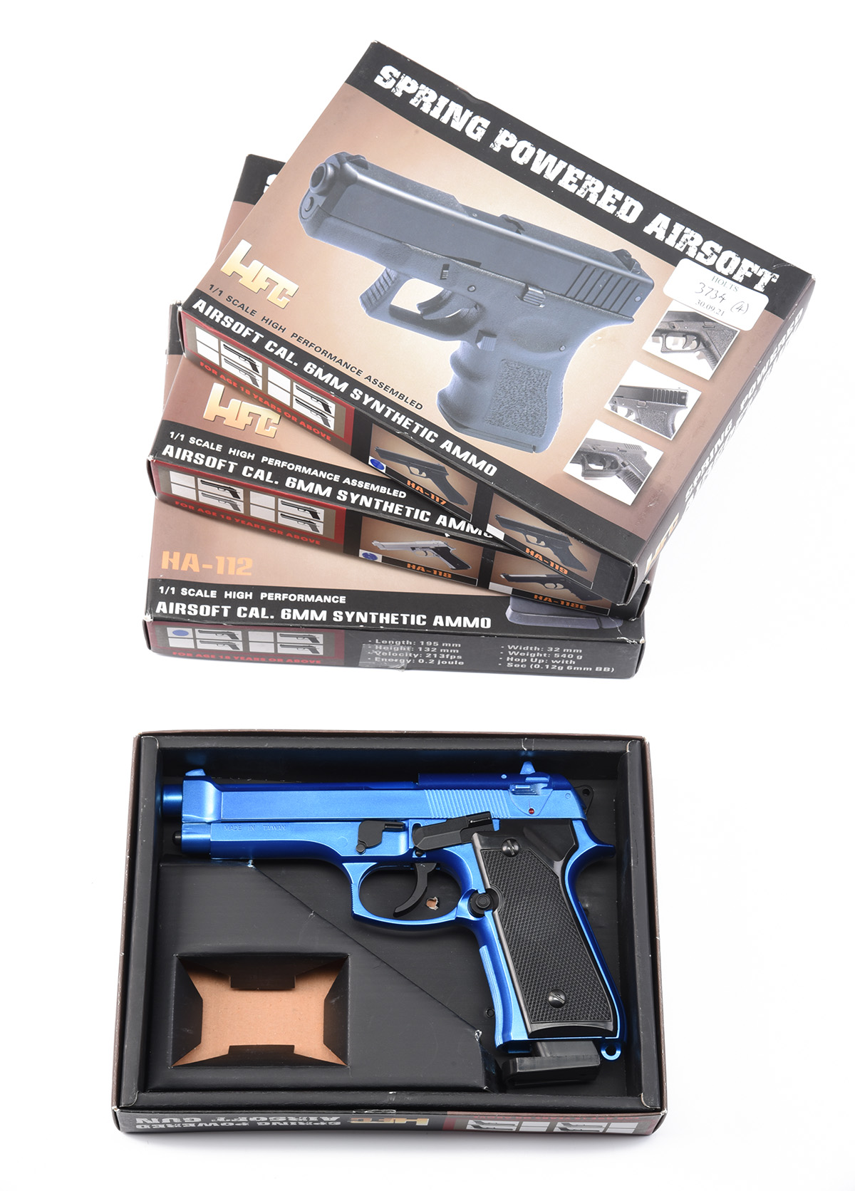 FOUR BOXED 6mm BB AIRSOFT AIR-PISTOLS, all different models and including a Sig-Sauer P226, a Beretta 92FS, an H&K USP and a Glock 17 style, all in their maker's cartons appearing unused, VCR Bill exempt