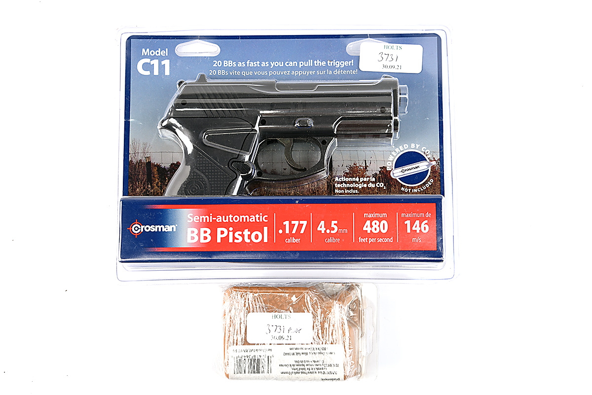 A NEW & UNUSED .177 CO2-POWERED AIR-PISTOL SIGNED CROSMAN, MODEL 'C11', serial number unknown, with 3 3/4in. barrel, black finish, unused and sealed in its manufacturer's plastic blister-pack together with 1200 copper bb's for same