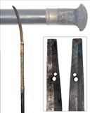 the blade possibly pre 1800, the curving 15 3/4in. blade signed on left side of the tang, false edged to the majority of the back edge and darkly stained, two 'mekugi-ana' to the 6 1/2in. tang, copper 'habaki' (traces of silvering), small oval iron 'tsuba' and fitted to a black laquered oval wood shaft of late Edo period decorated in crushed mother of pearl at the head, copper mounts, painted 'mon' to both sides near lower mount and carved finial to the tail, approx. 97 3/4in. overall