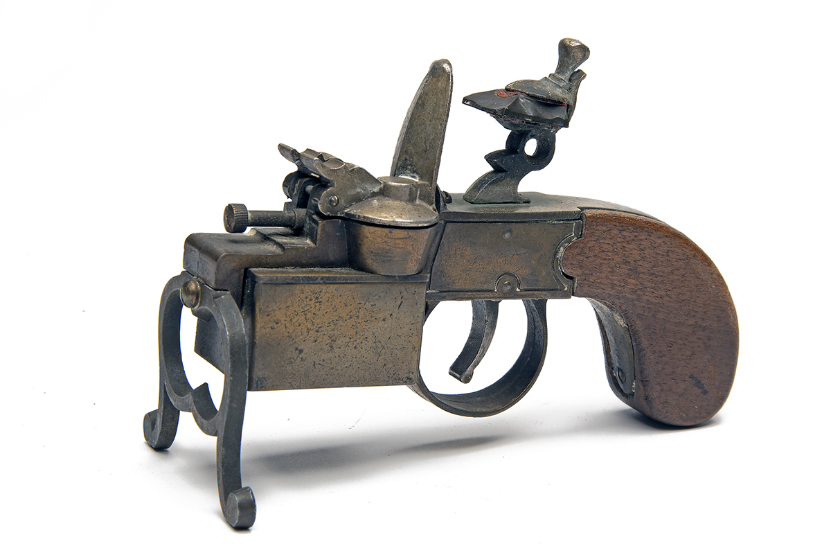 A 'TINDER PISTOL' TABLE LIGHTER IN THE FORM OF A FLINTLOCK TINDERBOX,