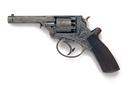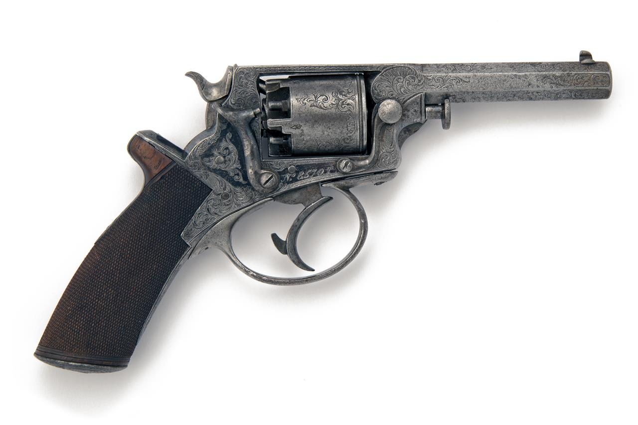 circa 1856, with octagonal 3 1/2in. barrel scroll engraved at both the muzzle and breech, border engraved top-strap signed 'W. POWELL & SON', plain London proved cylinder with scroll engraving over each chamber and with carved rope-twist band near leading edge, fully borderline and scroll engraved solid frame marked 'W. TRANTER PATENT' in an oval on the left side and with swinging chamber-lock safe on the right, finely chequered walnut saw-handled butt, fully engraved domed butt-cap and articulated rammer to the left side of barrel, strong traces of original blued finish remaining, overall length 9 1/4in., weight approximately 1 1/8lbs.