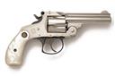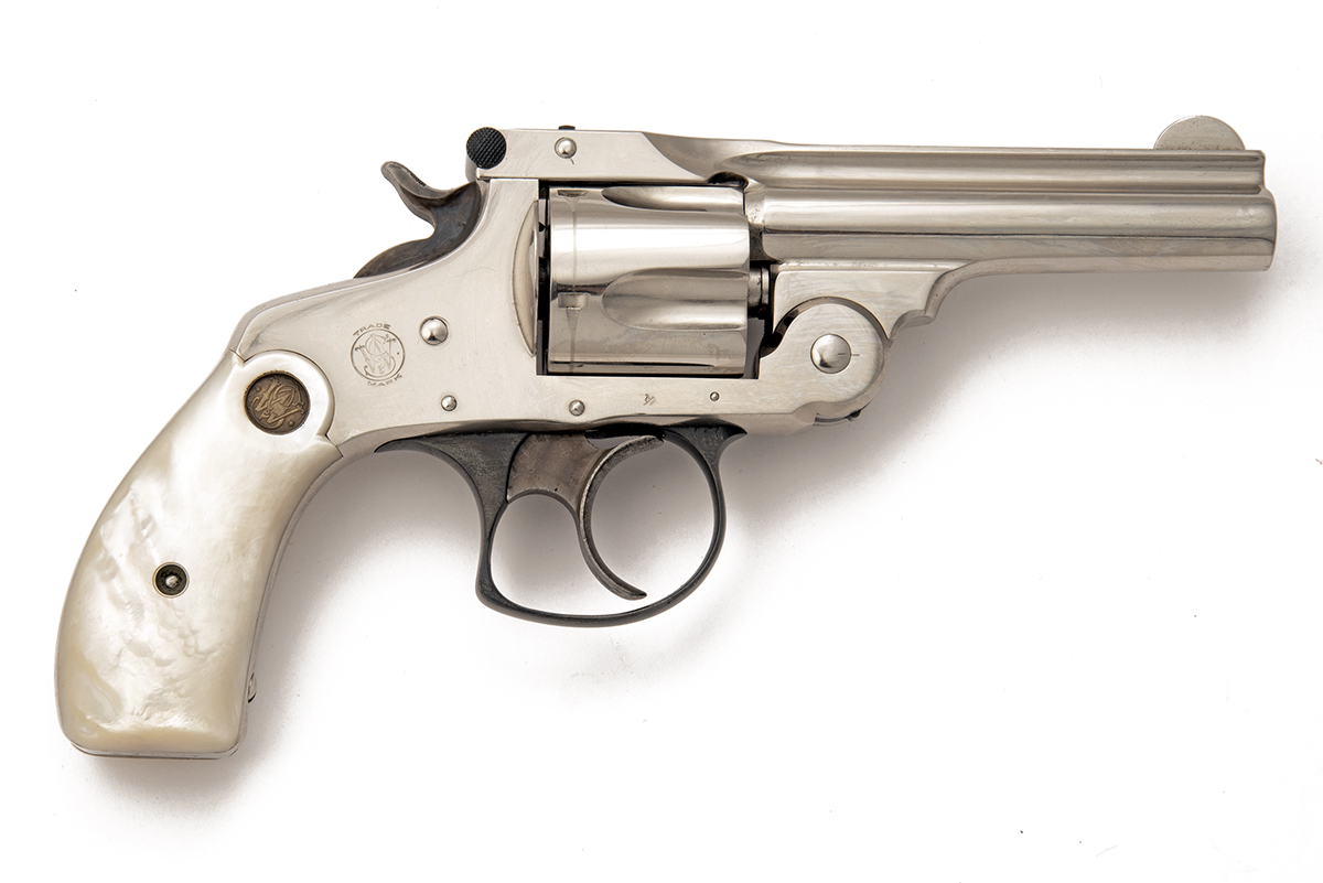 circa 1905, with nickel-plated 3 1/4in. barrel signed on the top-rib and with patent dates to 1889, crescent fore-sight, break-open frame with automatic ejecting fluted cylinder, plated frame, colour hardened hammer and trigger, blued trigger-guard and factory mother of pearl grips, the whole appearing little used and retaining apparently all its finish and colour, overall length 8 1/8in.