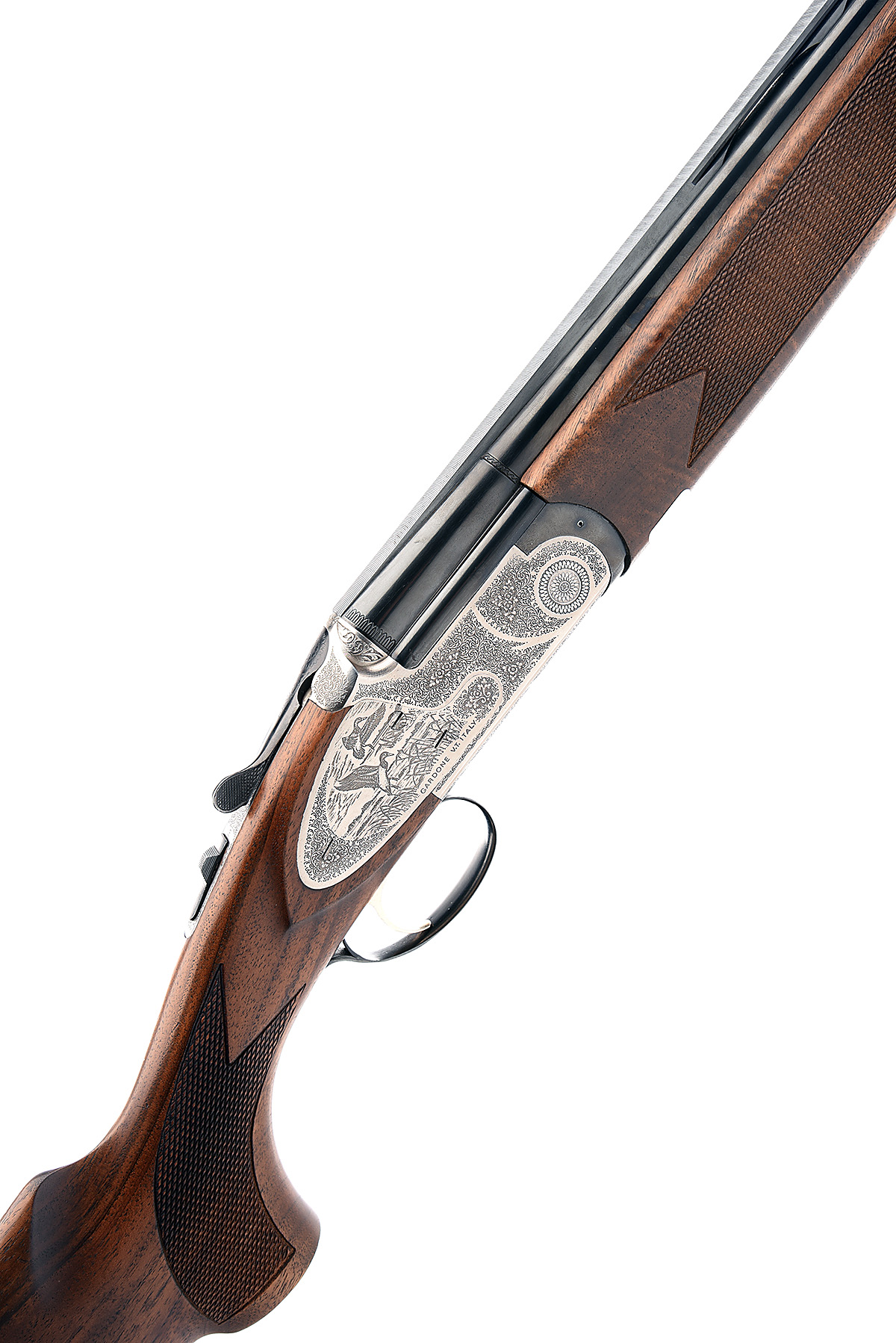 ARMI BETTINSOLI 12-BORE (3IN.) SINGLE-TRIGGER SIDEPLATED OVER AND UNDER EJECTOR, serial no. 72882, dated 1988, 27 5/8in. nitro barrels with ventilated mid-rib and 11mm ventilated matt top-rib, 3in. chambers, hold-open toplever, manual safety with integral barrel selector switch, gold-washed single trigger, floral scroll engraving, the decorative sideplates engraved with game scenes, bright finish, 14 1/4in. pistolgrip stock including buttplate, weight 7lb. 7oz.