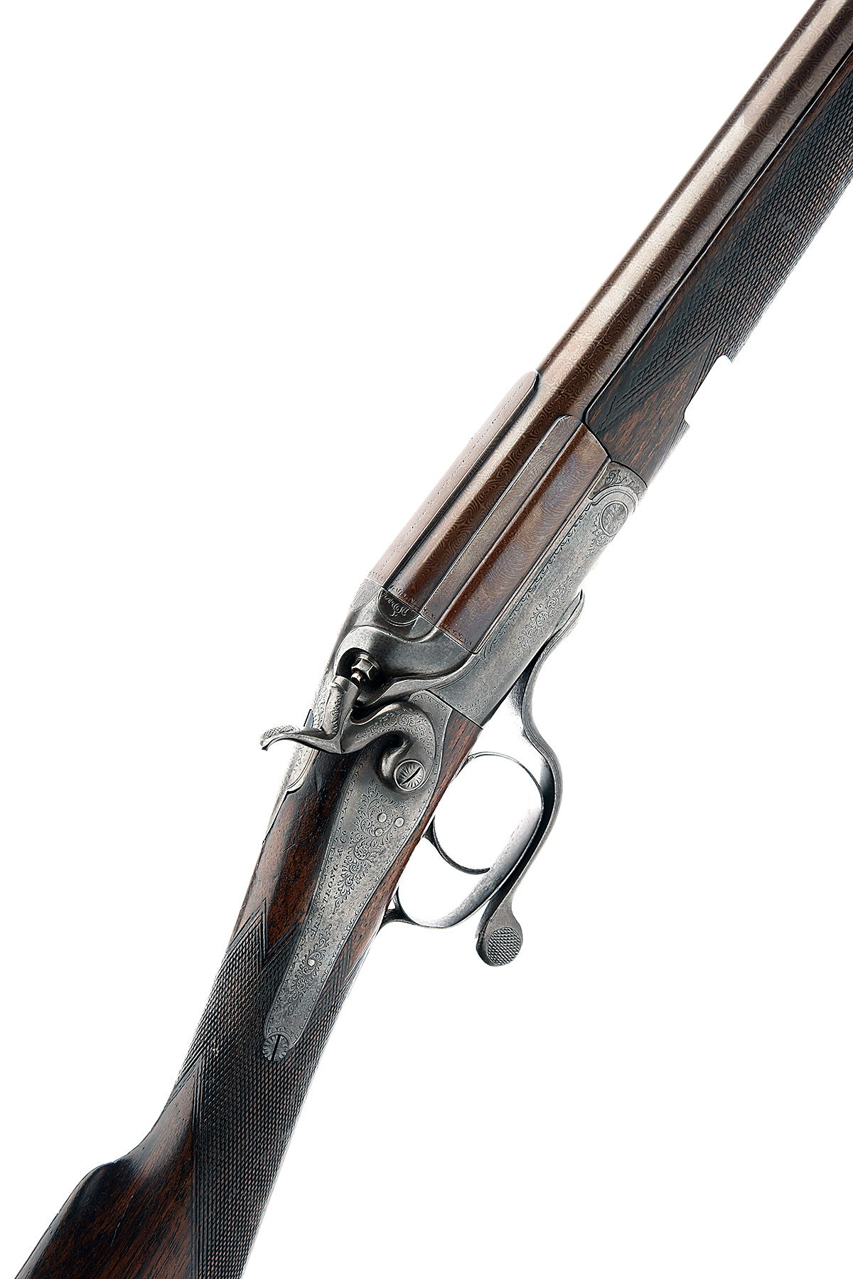 ARMSTRONG & CO. 12-BORE SINGLE-BARRELLED ROTARY-UNDERLEVER HAMMERGUN, serial no. 40694, circa 1900, barrel numbered 13263, 31in. nitro reproved damascus barrel with faceted breech-end, the top flat engraved 'ARMSTRONG & CO. NEWCASTLE ON TYNE.', 2 1/2in. chamber, bored approx. 1/2 choke, Jones patent underlever, rebounding back-action lock, border and scroll engraving, patinated finish, 14in. replacement stock including steel buttplate, (crack to rear of top tang, small repair to underhorn),Hackett-type snap on fore-end with horn finial, weight 4lb. 14oz.