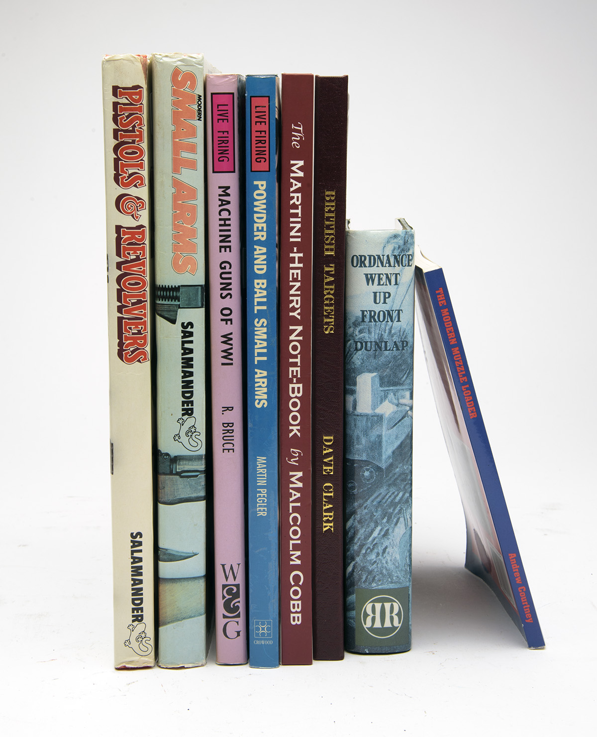 A COLLECTION OF EIGHT SHOOTING RELATED BOOKS, comprising of 'THE MODERN MUZZLE LOADING', 'ORDNANCE WENT UP FRONT' by Roy F. Dunlap, 'BRITISH TARGETS FROM THE MID 19tH CENTURY TO DATE' by Dave Clark, 'THE MARTINI-HENRY NOTE-BOOK' by malcome Cobb, 'POWDER AND BALL SMALL ARMS' by Pegler, 'THE MACHINE GUNS OF WORLD WAR I' bt robert Bruce, 'MODERN SMALL ARMS', 'PISTOLS & REVOLVERS'