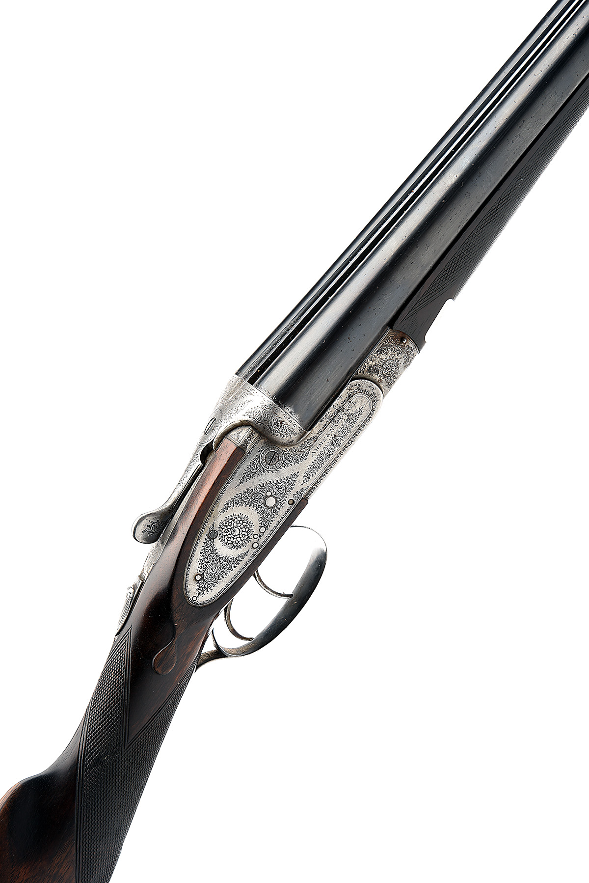removable striker discs, automatic safety, bouquet and scroll engraving, 15in. replacement stock, weight 6lb. 11oz. (original) 6lb. 13oz. (extra), in a brass-cornered oak and leather case with provision for both sets of barrels