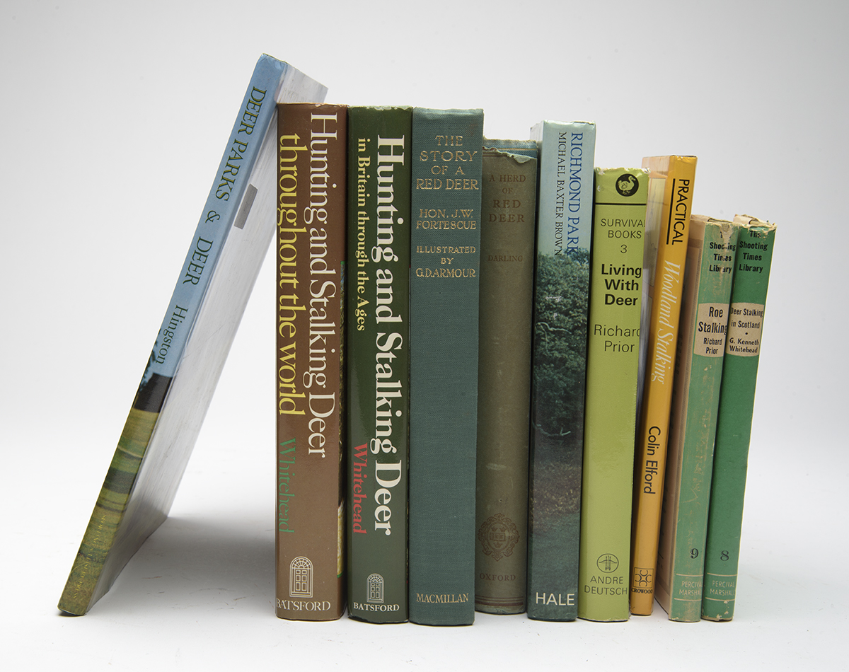 A COLLECTION OF SHOOTING RELATED BOOKS, comprising of 'DEER PARKS' by Hingston, 'HUNTING AND STALKING THROUGHOUT THE WORLD' by G. Kenneth Whitehead, 'HUNTING AND STALKING DEER' by G. Kennith Whitehead, 'THE STORY OF A RED DEER' by HON. j.W. fortescue, 'A HERD OF RED DEER' by F. Fraser Darling, 'RICHMOND PARK' by Michael Baxter Brown, 'PRACTICAL WOODLAND STALKING, 'ROE DEER' Richard Prior, 'DEER STALKING' by G. kenneth Whitehead, 'LIVING WITH DEER' by Richard Prior