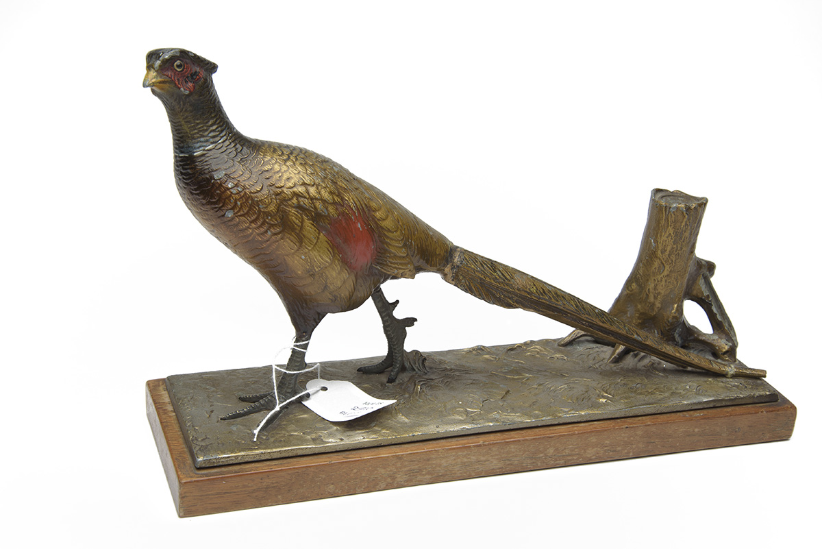 A PAINTED BRONZE OF A FULL-MOUNT PHEASANT SET ON A BRASS PLAQUE,