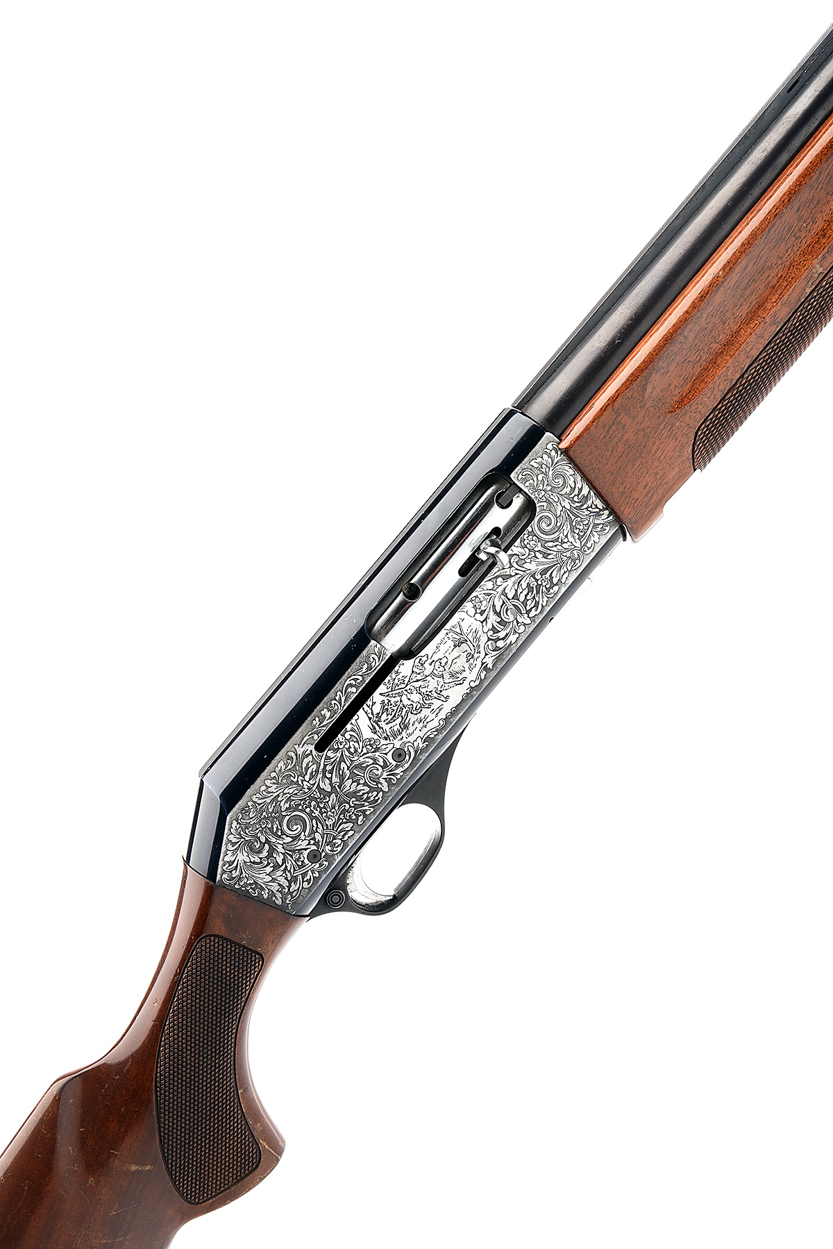 FABARM 12-BORE SEMI-AUTO SHOTGUN, serial no. 472401, circa 1979, restricted magazine, 26in. nitro barrel with 6mm ventilated matt rib, 2 3/4in. chamber, bored approx. 1/4 choke, manual push-button safety, blacked action with silver side panels engraved with acanthus and floral scrolls surrounding game scene vignettes, 14 1/4in. pistolgrip stock including buttplate, weight 7lb. 4oz.