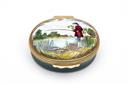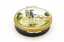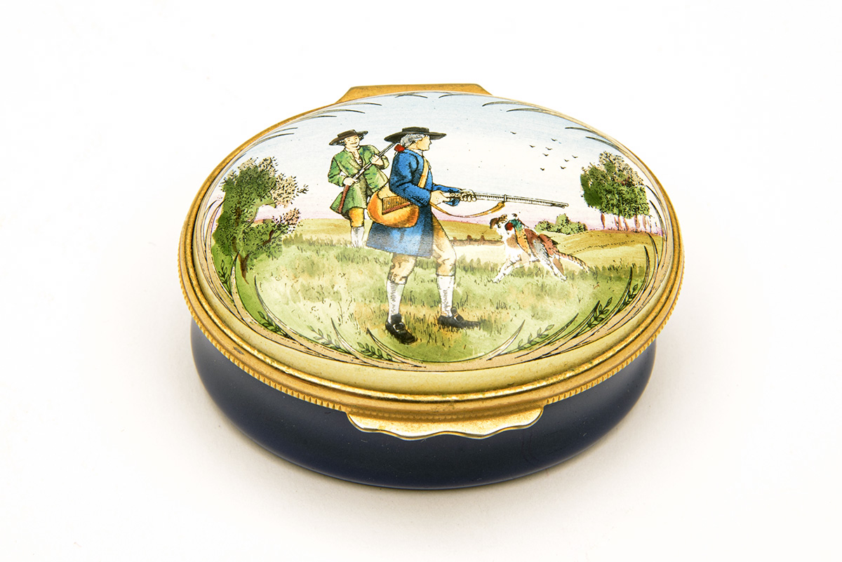 TWO HALCYON DAYS ENAMEL GAME SCENE PILL BOXES