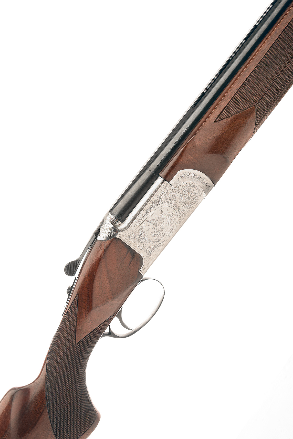 LAMES 12-BORE 'MOD. 801' SINGLE-TRIGGER OVER AND UNDER EJECTOR, serial no. 30682, dated 1977, 30in. nitro barrels with ventilated mid-rib and 10mm ventilated matt top-rib, 2 3/4in. chambers, bored approx. 1/2 and 3/4 choke, hold-open toplever, manual safety with integral barrel selector switch, acanthus scroll engraving surrounding game scenes, bright finish, 14 1/2in. pistolgrip stock including 1in. ventilated rubber recoil pad