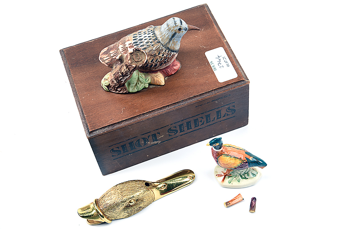 A VINTAGE WOODEN 'SHOT SHELL' AMERICAN WOODCOCK BOX, together with a duck whistle, porcelain pheasant