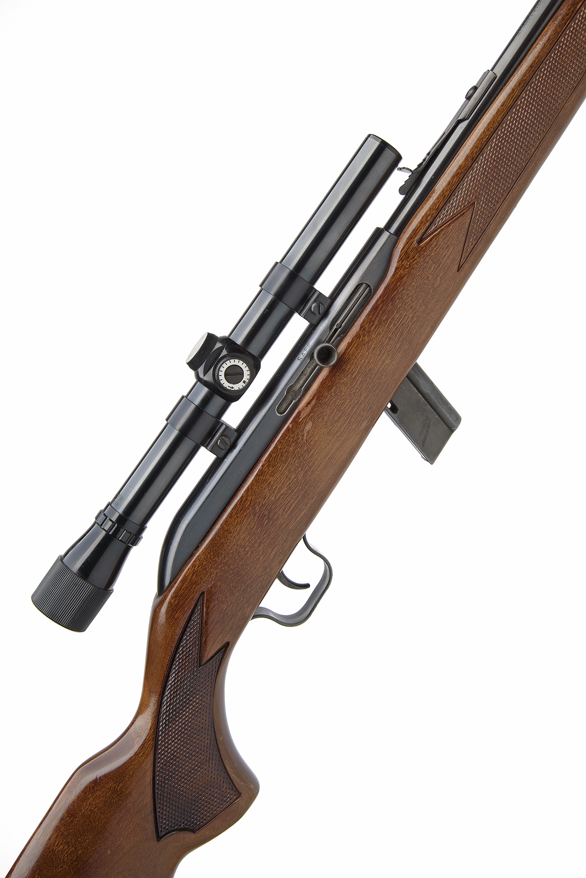 LAKEFIELD .22 L.R. 'MODEL 64B' SELF-LOADING SPORTING RIFLE, serial no. L012843, circa 1960, 20in. nitro barrel, threaded for sound moderator, fore-sight broken, leaf rear-sight, fitted with a Weaver D4 telescopic sight, manual safety, detachable magazine, pistolgrip stock, overall length 40in.