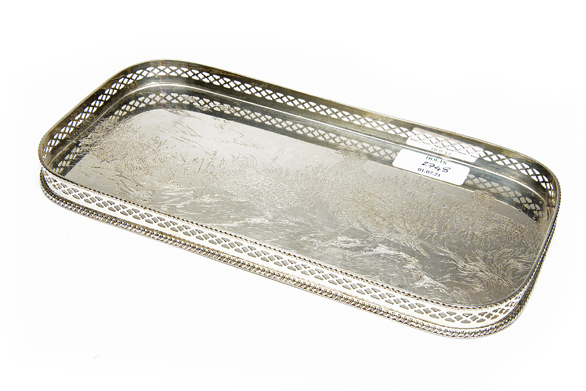 'THE FAMOUS GROUSE' SILVER-PLATE 'GROUSE' SMALL DRINKS TRAY, 12in. by 6in., decorated with a scene of grouse marked 'C. Stanley Todd. 1986',