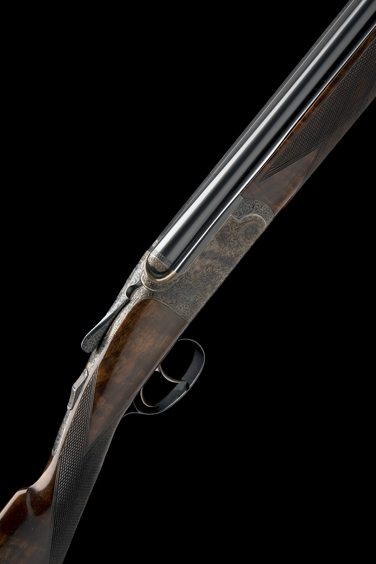 for 2014, 30in. nitro chopperlump barrels with 6mm raised matt top-rib, gold-inlaid '1' at the breech end, and side-ribs, over barrel engraved 'DAVID McKAY BROWN 32 HAMILTON ROAD BOTHWELL SCOTLAND', 2 3/4in. chambers, bored approx. imp. cyl. and 1/4 choke, hold-open toplever gold-inlaid '1', automatic safety with gold-inlaid 'SAFE' detail, the action and furniture profusely engraved with the McKay Brown 'Classic Scottish Scroll' design on a finely matted background, the makers name engraved in cartouches to the left and right of the action bar, retaining virtually full original colour-hardening and finish, the fore-end decorated en suite, 15 1/4in. highly-figured stock, weight 6lb. 10oz., in its lightweight leather case