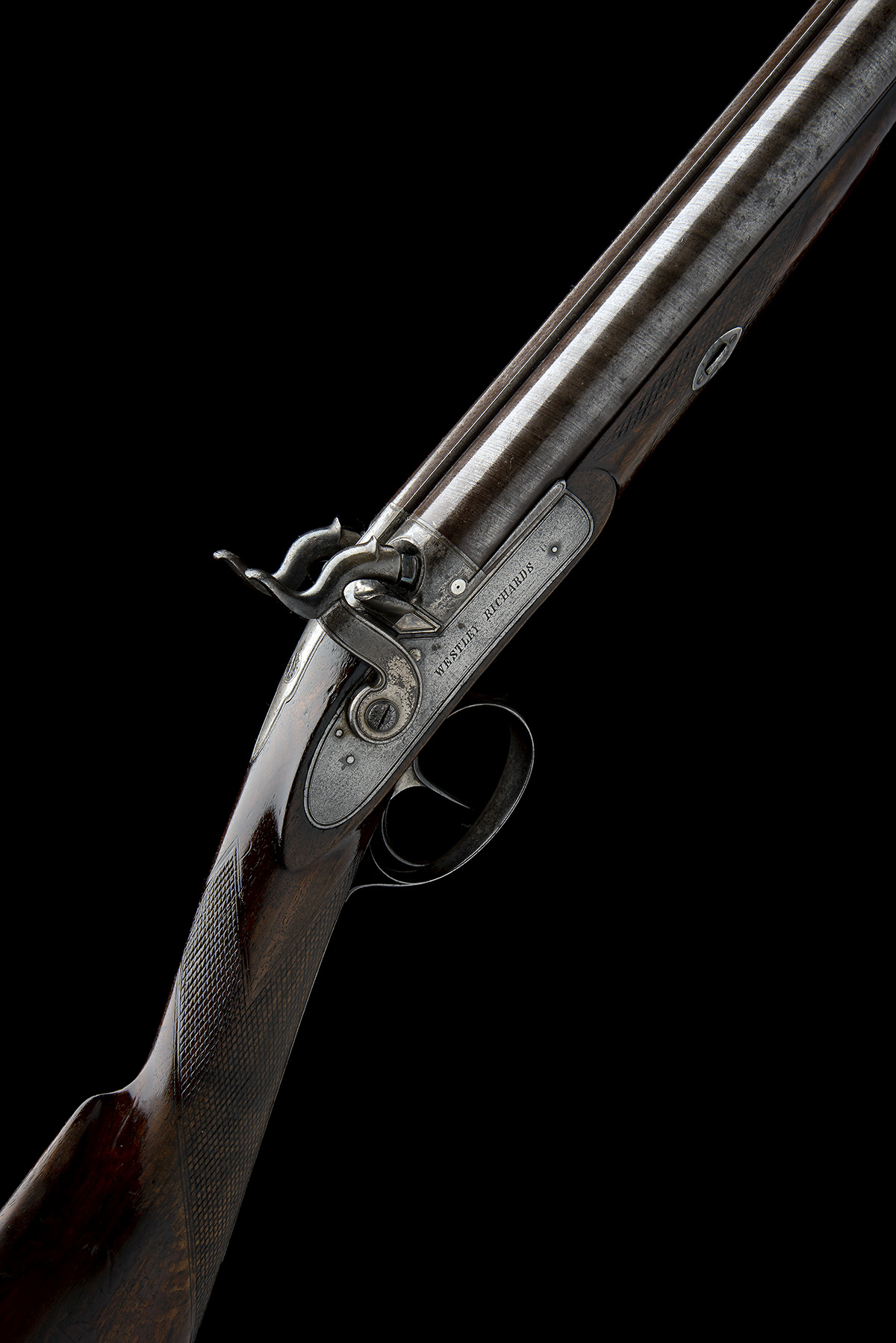 AN UNUSUAL 12-BORE PERCUSSION DOUBLE-BARRELLED SPORTING-GUN SPURIOUSLY SIGNED WESTLEY RICHARDS, no visible serial number,