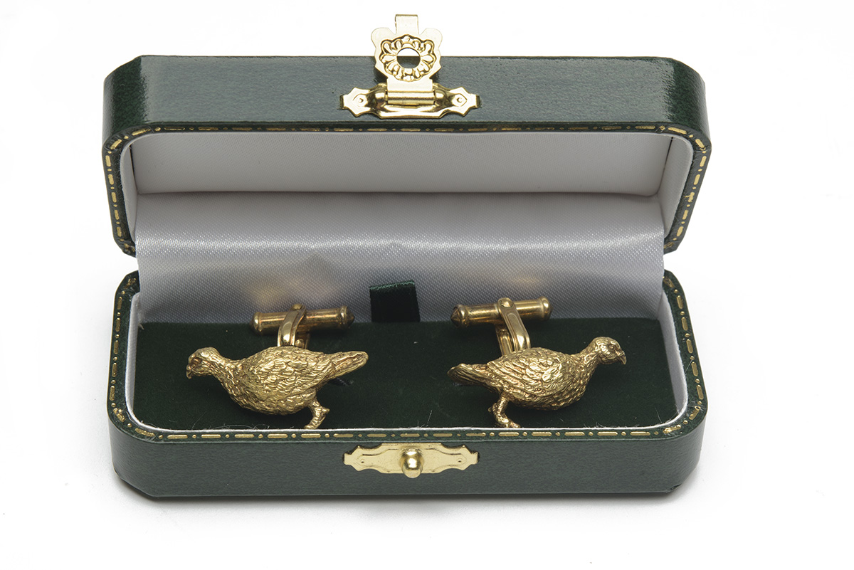 A PAIR OF SOLID SILVER GILT-PLATED GROUSE CUFFLINKS, marked 925, with full-mount grouse in their silk & green velvet lined leather case