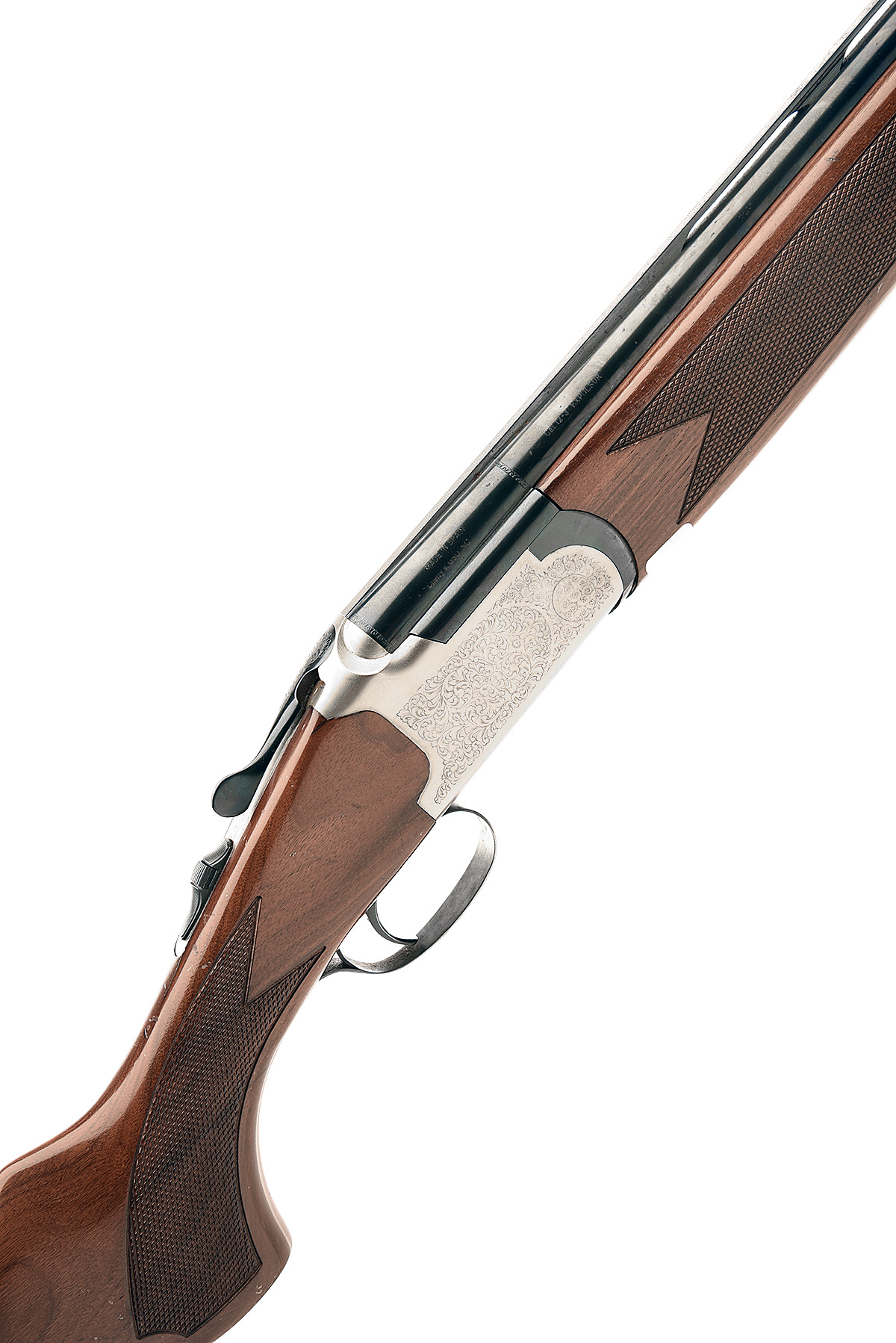 LANBER 12-BORE SINGLE-TRIGGER OVER AND UNDER EJECTOR, serial no. 13-03-08000-05-12-76, dated 2005, 28in. nitro barrels with 6mm ventilated matt top-rib and ventilated mid-rib, 3in. chambers, multichokes (no spares), hold-open toplever, automatic safety with integral barrel selector switch, scroll engraving, satin finish, 14 3/4in. pistolgrip stock (cracked through hand) including 3/4in. recoil pad, weight 7lb. 8oz.