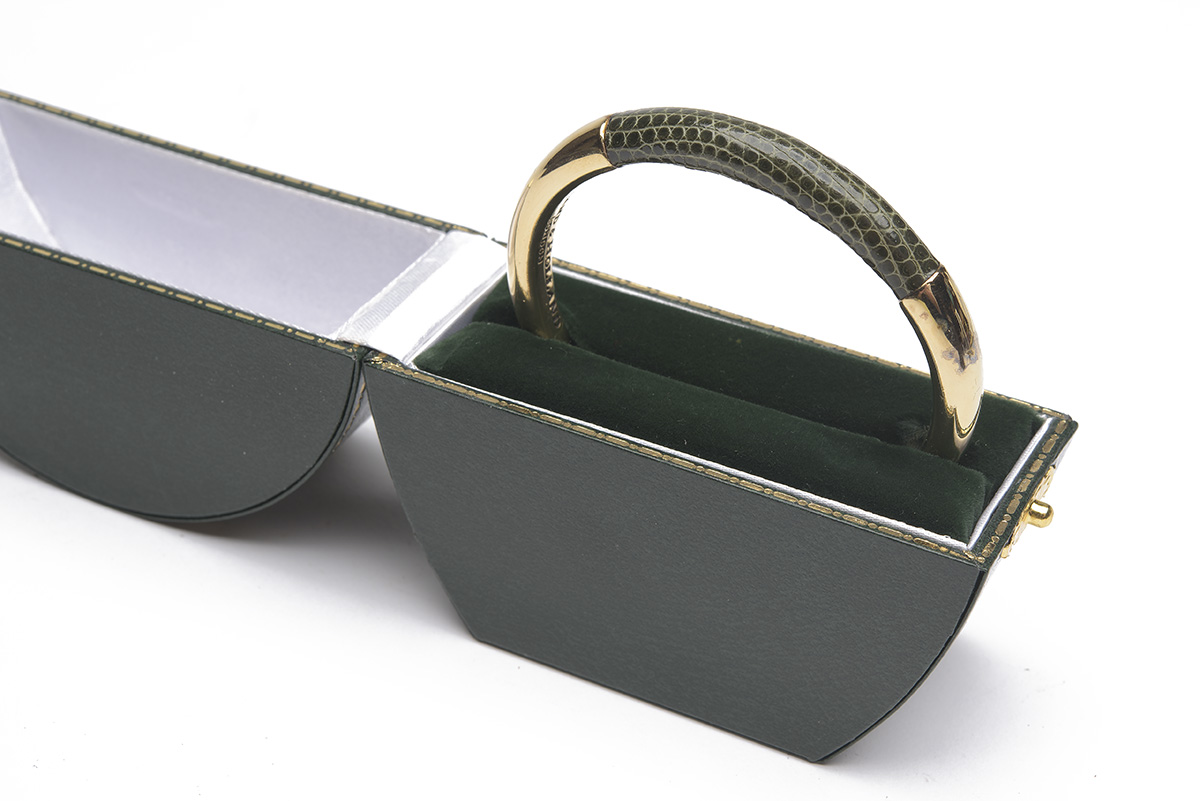 A GOLD METAL AND SNAKE SKIN BOUND BRACELET SIGNED HOLLAND & HOLLAND with leather velvet-lined case