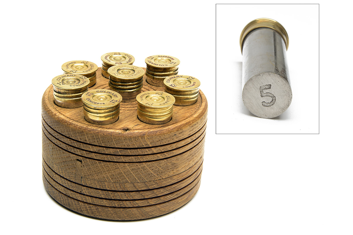 AN OAK CULINARY CONCEPT PLACE FINDER IN THE FORM OF A 12-BORE CARTRIDGE
