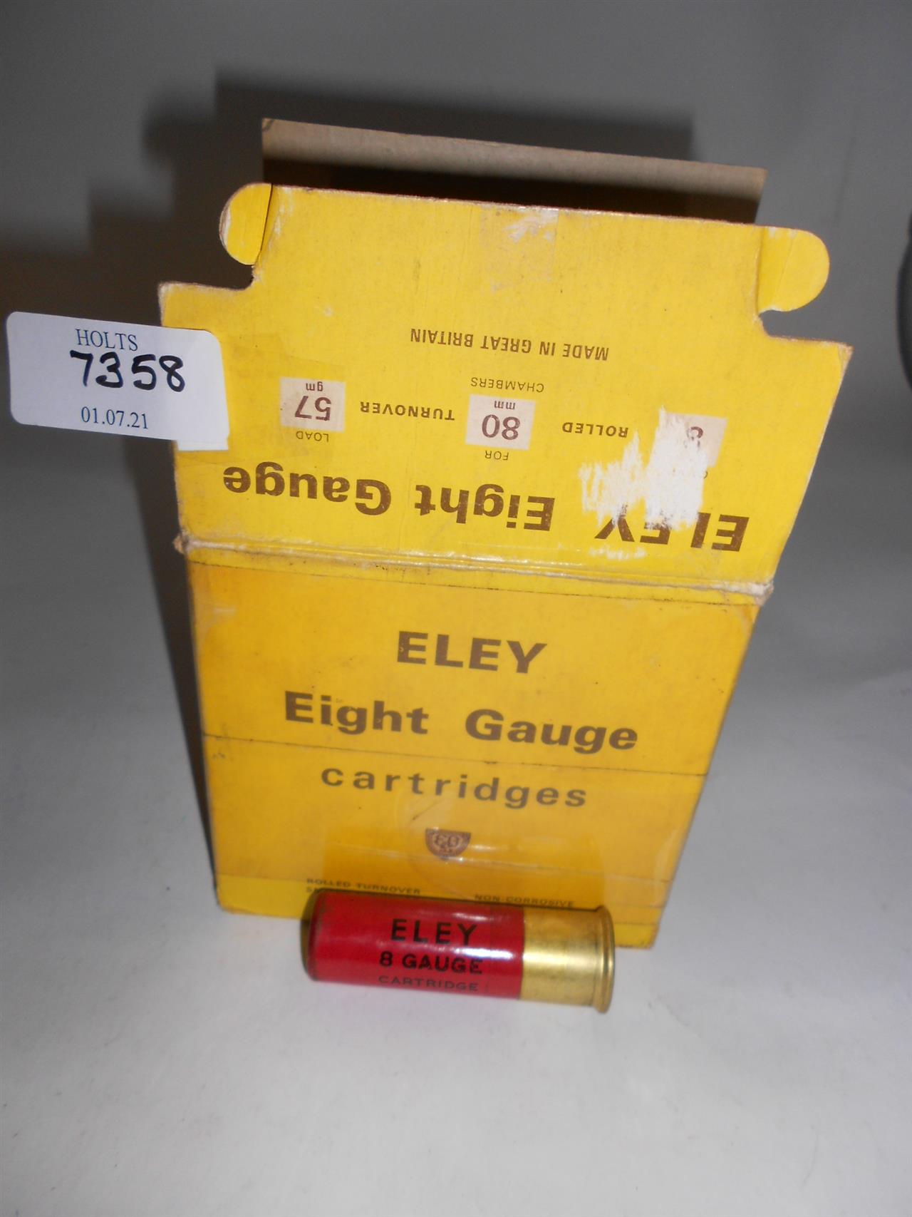 25 ELEY 8 BORE, CARTRIDGES, 80mm, 57grm, BB SHOT, Please be advised that cartridges/ammunition, primers, primed cases, blanks and percussion caps cannot be sent to you by post or carrier. If you wish, you can book a collection at one of our regional valuation days, or collect from our offices at PE31 6HA in Norfolk