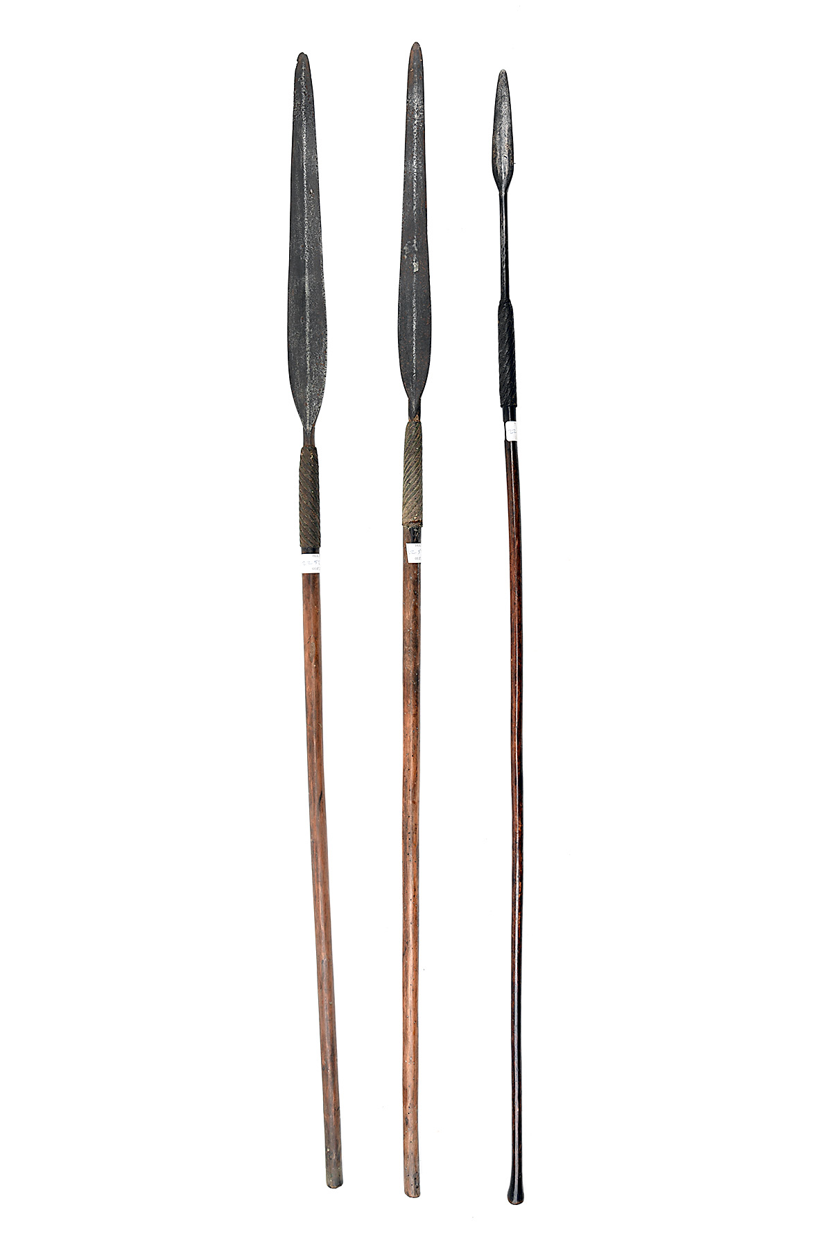 A GROUP OF THREE ZULU ASSEGAI SPEARS circa late 19th Century, two Iklwa stabbing spears with approx 15in, blades, tang-mounted to wooden shafts with copper wire binding, 52in. overall, together with a throwing spear with 5 1/2in. blade with long tang mounted into a wooden shaft and bound with copper wire, rusted and worn with some splitting to the shafts, 51in. overall