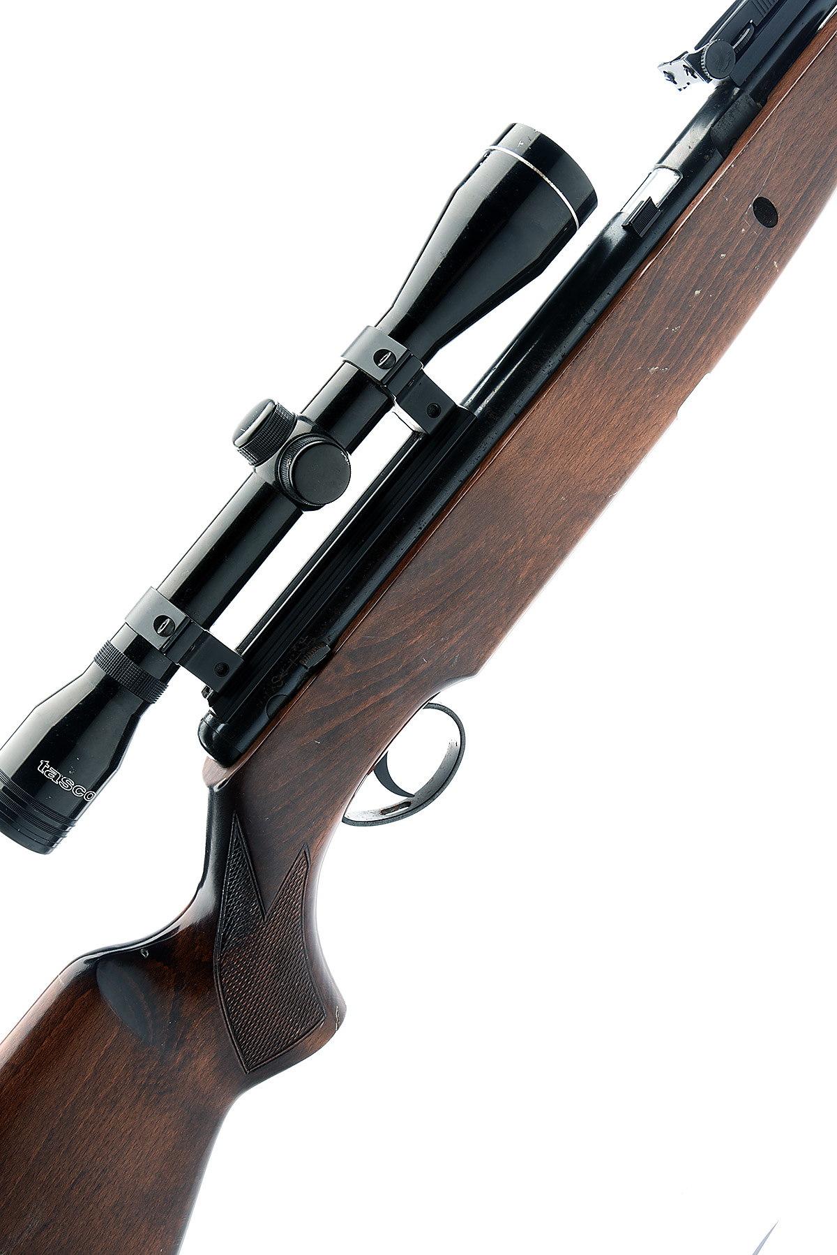 A .22 UNDER-LEVER AIR-RIFLE SIGNED BSA, MODEL 'SUPERSTAR', serial no. RH19004, with sighted 19in. barrel including adaptor for a sound-moderator (moderator absent), rotary breech, air-chamber with applied rail and beech half-stock, fitted with a Tasco 4x40 telescopic sight, 43in. overall